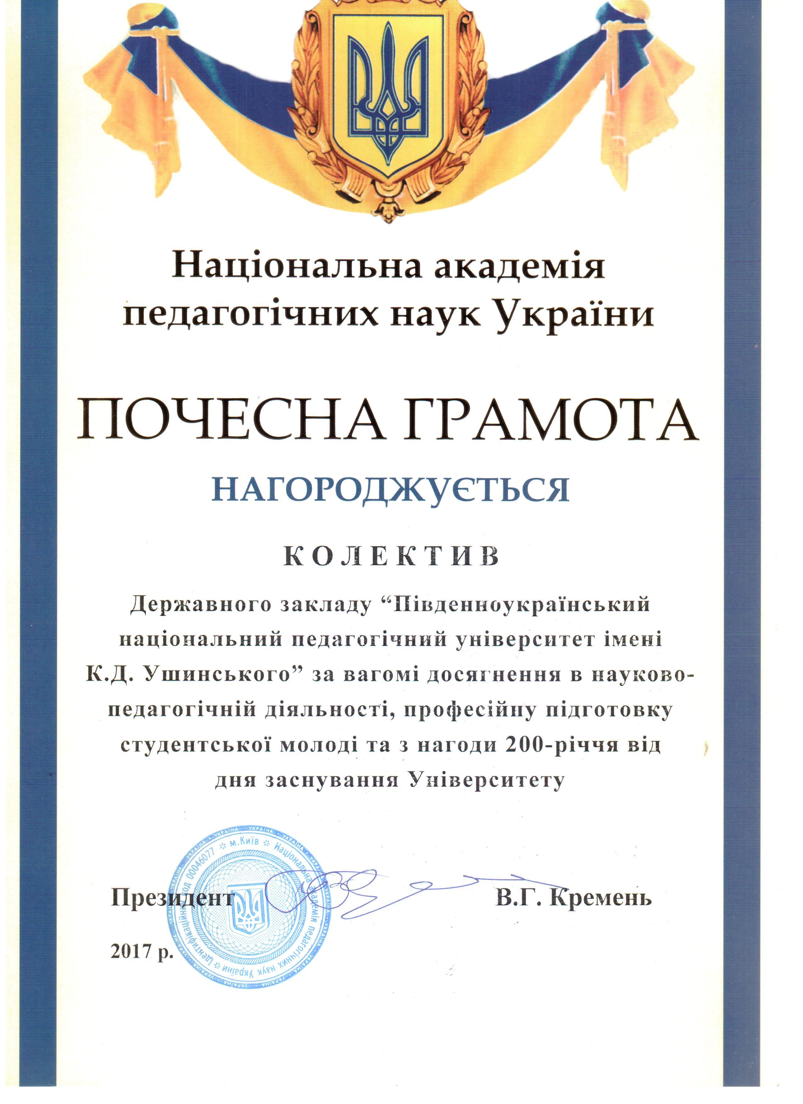 Щиро вітаю вас із знаменною датою - 200-річчям Південноукраїнського національного педагогічного університету імені К. Д. Ушинського