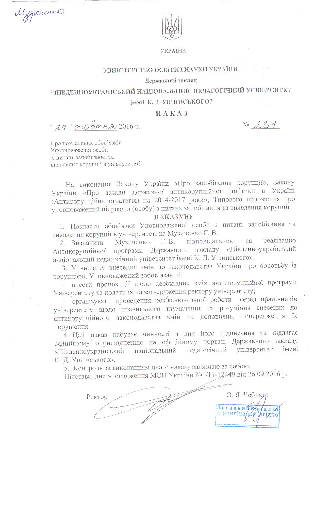 2. Наказ про покладення виконання обов'язків керівника Уповноваженого підрозділу з питань запобігання та виявлення корупції в університеті.