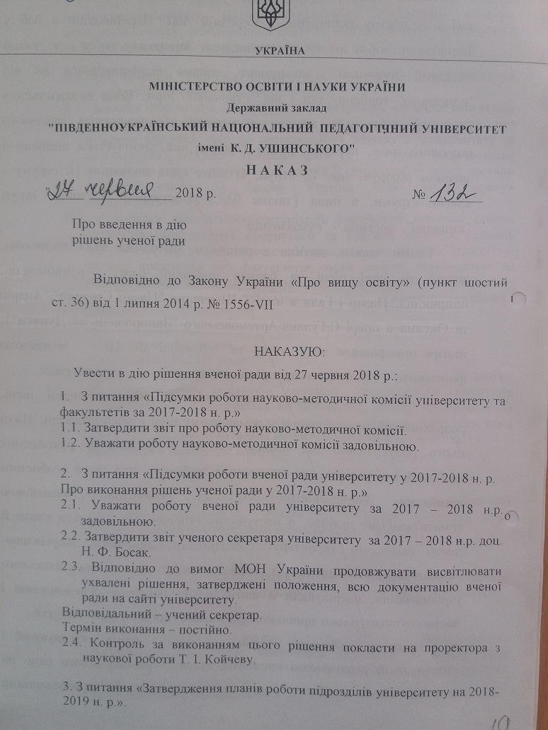 Наказа про введення в дію рішень ученої ради №132 від 27 червня 2018