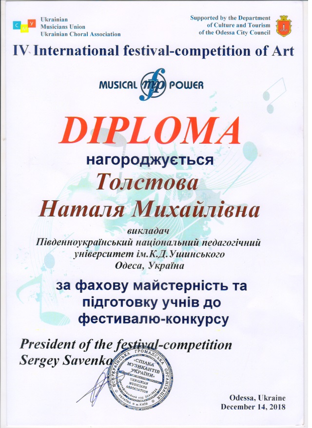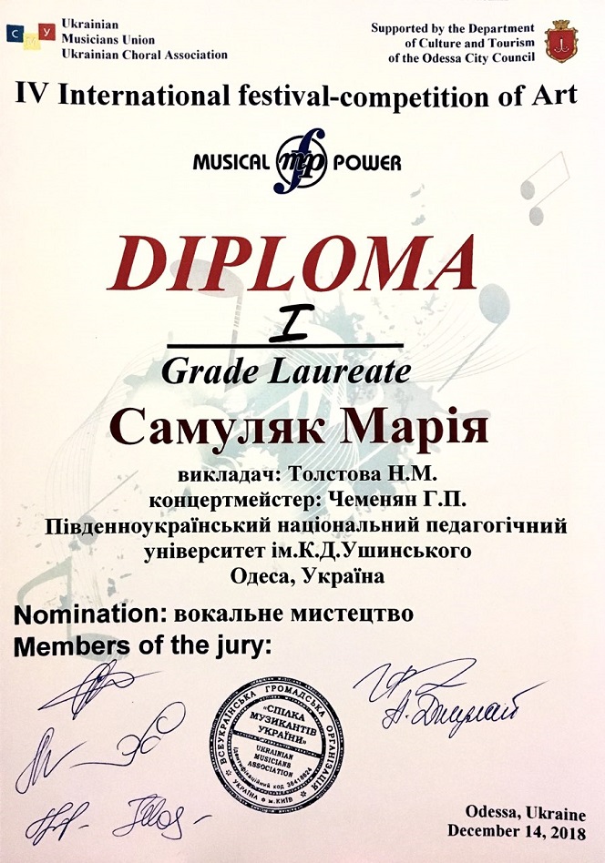 Congratulations to the graduate student of the Faculty of Music and Choreography Maria Samulyak (class teacher T. N. Tolstova, concertmaster G.P. Pogosyan) with the victory and the title of First Class Laureate in the nomination "Academic Vocal" at the IV International Festival "Musical Power 2018", which took place on December 14 in Odesa.