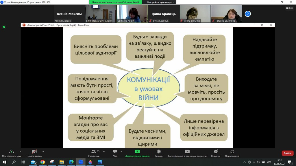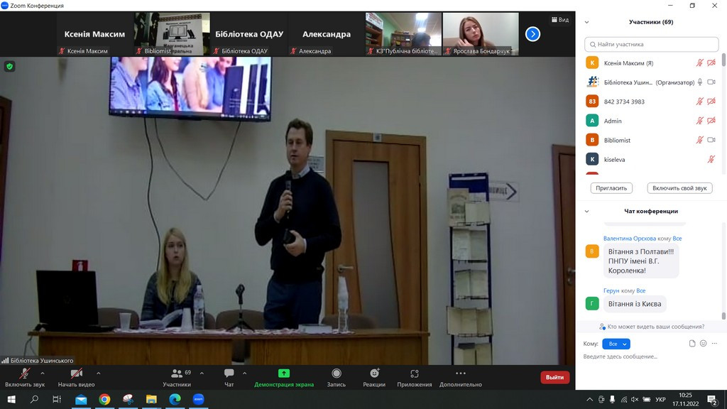The presentations were made by Ushynsky University staff, representatives of scientific libraries in Odesa and other cities of Ukraine, namely: Odesa National Scientific Library, Odesa Regional Universal Scientific Library named after M. S. Hrushevskyi, Vernadsky National Library of Ukraine, the library of Vinnytsia Mykhailo Kotsiubynskyi State Pedagogical University, the National Scientific Medical Library of Ukraine, the Luhansk Regional Universal Scientific Library, the library of National Pirogov Memorial Medical University, Vinnytsya.