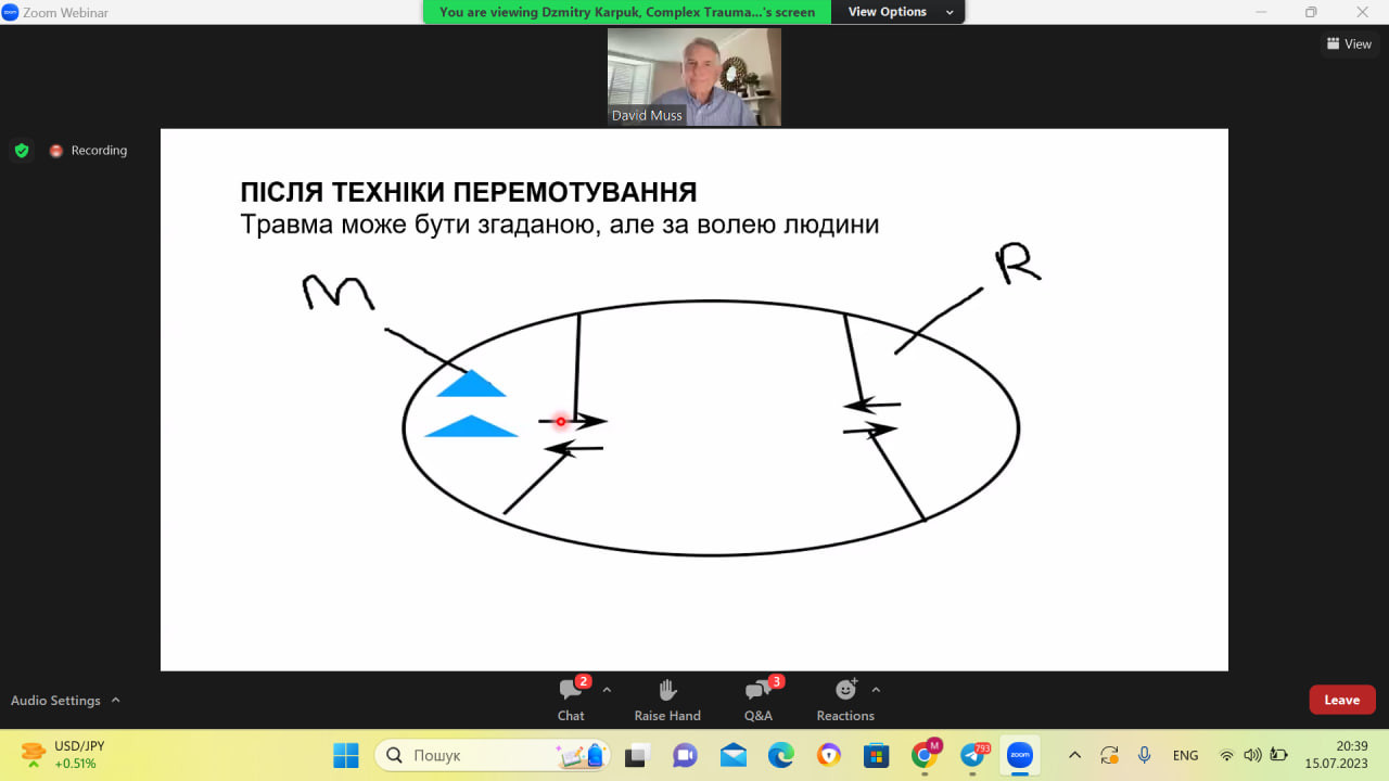 15 липня 2023 року на платформі Zoom аспіранти-психологи долучилися до вебінару Доктора Девіда Мусса Вступ до Техніки Перемотування травматичного досвіду / Introduction to The Rewind Trauma Therapy.