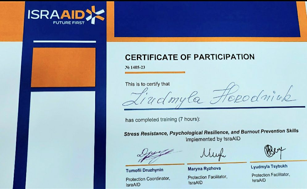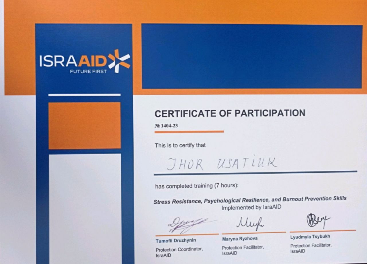 06 жовтня 2023 року здобувачі третього (освітньо-наукового) рівня вищої освіти ОНП «Філософія» Людмила Городнюк та Ігор Усатюк взяли участь в офлайн-заході психологічного спрямування для аспірантів, асистентів викладачів, викладачів-стажистів, молодих фахівців, що відбувся в затишній читальній залі бібліотеки Університету Ушинського на тему «Стресостійкість, психологічна стійкість та навички протидії вигоранню». Разом з ведучою тренінгу, психологом міжнародної гуманітарної організації IsraAID Людмилою Цибух аспіранти вчилися працювати з власним ресурсом, розуміти, з чого він складається та як ним керувати під час життєвих викликів і вирішення проблем. Тренінг проходив у межах стратегії міжнародної гуманітарної організації IsraAID на базі Південноукраїнського центру професійного розвитку керівників та фахівців соціономічної сфери Університету Ушинського.