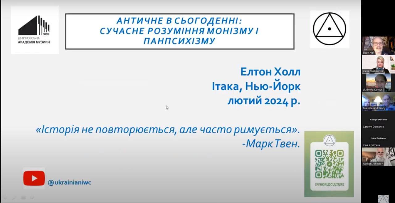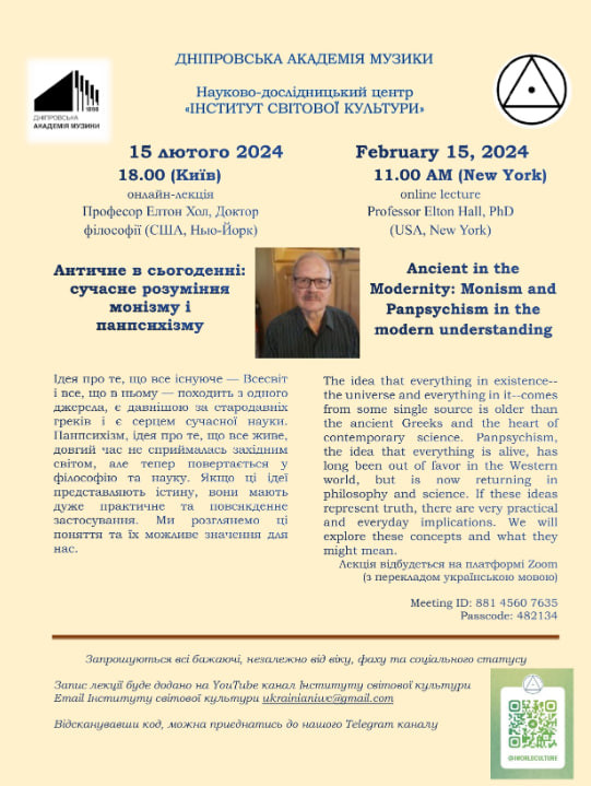 Ідея по те, що все існуюче – Всесвіт, і все, що в ньому, походить з єдиного джерела, не є новою; це питання підіймалося як стародавніми греками, так і сучасними науковцями і філософами. 15 лютого 2024 року на запрошення проф. Юлії Шабанової, директорки НДЦ «Інститут світової культури» (Дніпровська академія музики, ЗВО-партнер) здобувачі третього (освітньо-наукового) рівня вищої освіти ОНП «Філософія» мали нагоду доєднатися до надзвичайно цікавої гостьової лекції «Античне в сьогоденні: сучасне розуміння монізму і панпсихізму». Спікер – проф. Елтон Хол, доктор філософії, США, Нью-Йорк. Те, що колись здавалось втраченим, або ж немодним, застарілим, часто повертається в наше життя в нових образах та практичних значеннях: говорили про монізм, панпсихізм та телеологію, що в різні періоди розвитку філософської думки ігнорувались мислителями, однак ніколи не були втрачені. ХХІ століття – нова ера в історії, новий світ, нові змісти, цінності та практичні рішення…