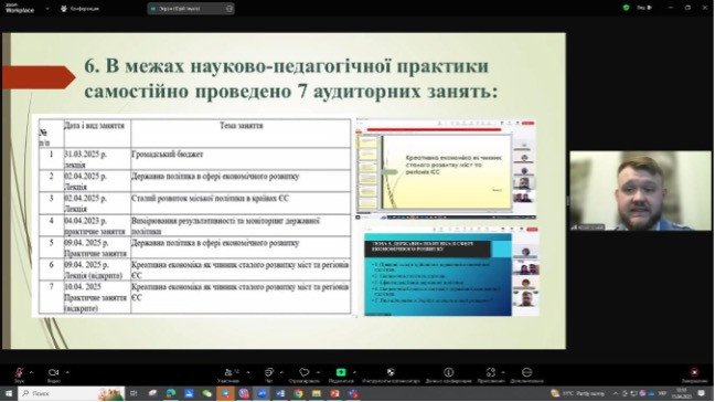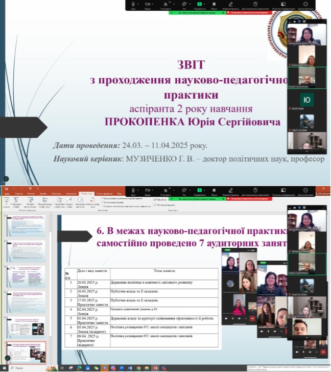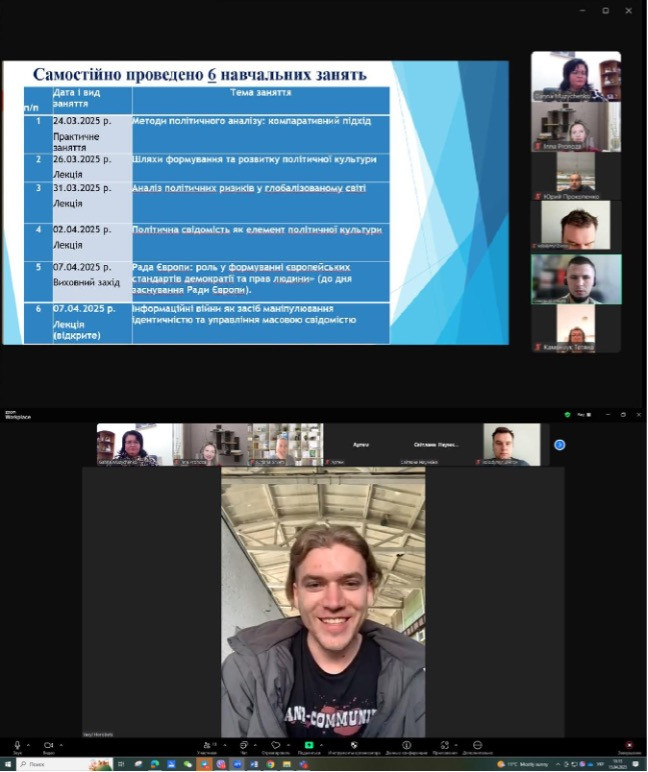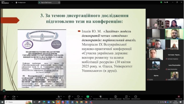 215 квітня 2025 року аспіранти кафедри політичних наук і права Університету Ушинського другого року навчання звітували про результати проходження науково-педагогічної практики, передбаченої освітньою складовою програми підготовки докторів філософії за спеціальністю С2 (052) Політологія.