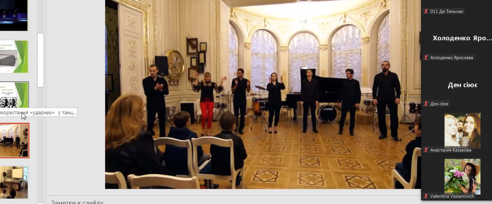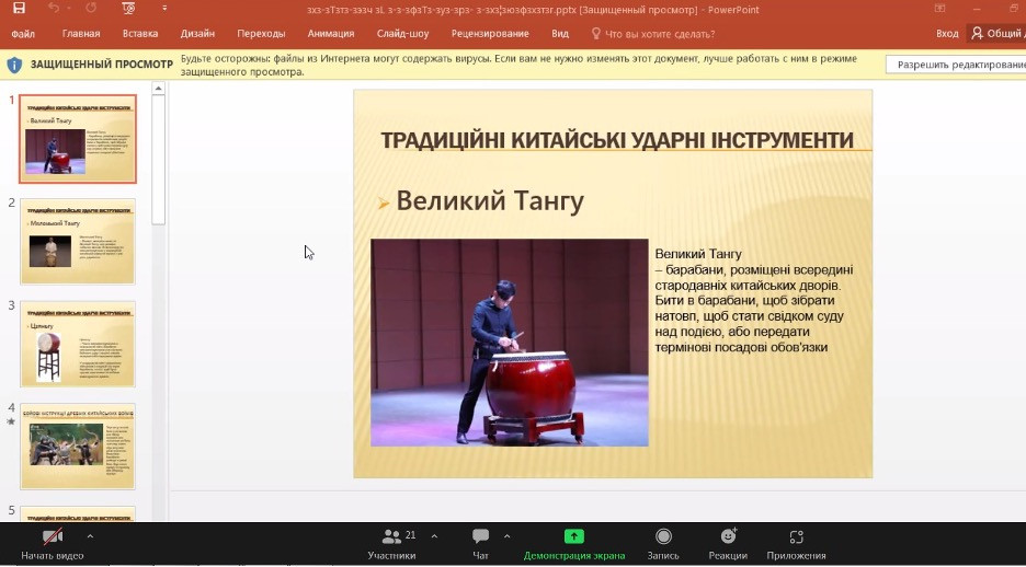 У межах лабораторії «Інновації мистецької освіти» аспіранти кафедри музичного мистецтва і хореографії Ганна Рало (спеціальність 014 Середня освіта. Музичне мистецтво, науковий керівник – проф. Г.Ю.Ніколаї) і Ді Тяньчао (спеціальність 011 Освітні, педагогічні науки ОНА «Мистецька педагогіка вищої освіти», науковий керівник – доцент С.Д.Клюєва) провели відкриту лекцію-презентацію для магістрантів спеціальності 025 Музичне мистецтва та 014 Середня освіта (Музичне мистецтво). Тема лекції була присвячена художньо-ментальним властивостям ударних інструментів. Аспіранти вивчають курс «Основи художньо ментальності: педагогічна проєкція». Окремі аспекти дисципліни аспірантами були взяти до уваги задля власних дисертаційних досліджень. Результатом опанування цієї вибіркової дисципліни стало їхнє бажання провести відкриту лекцію-презентацію для магістрантів на тему: «Ударні музичні інструменти у культурній спадщині людства».
