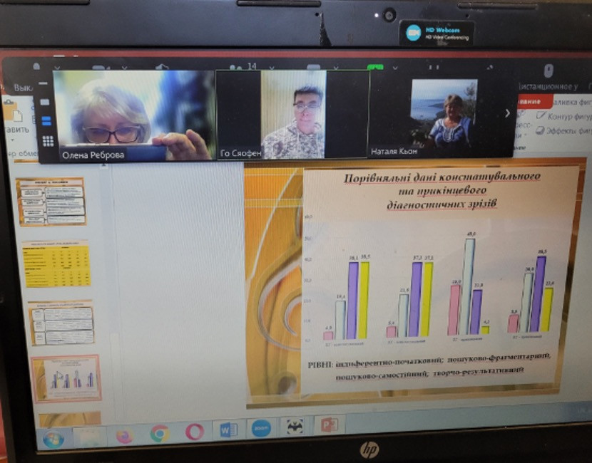 Аспірант Го Сяофен (науковий керівник – кандидат педагогічних наук, професор Н.Г. Кьон) ознайомив присутніх із результатами дослідження на тему: «Підготовка майбутніх учителів музичного мистецтва до вокально-фахової та диригентсько-хорової діяльності за поліфункціональним підходом». Його презентація проілюструвала основні етапи розв’язання складних дослідницьких завдань.