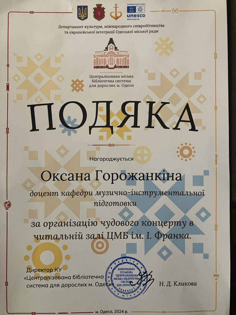 In an atmosphere of creativity and high spirits, a concert by students of the Faculty of Music and Choreography took place on October 12 in the Central City Library named after Ivan Franko. Ukrainian folk songs and legendary songs of Ukrainian pop music were performed by soloists Daria Polyakova, Mykhailo Shterenberg (teacher Z.S. Dubovy), X Xiaoxia, Wang Yunze, He Xiao, Zhang Bo, Liu Jiamin (teacher Shpak G.O.), Liang Weihun, ensemble of students of the 3rd year (teacher O.M. Kalyuzhna). The audience greeted the performances of the piano duets of Inna Hlushchenko and Elizaveta Stamataki (teacher O.R. Novska) and Li Longze and Wu Xiaotong (teacher M.G. Demydov) with thunderous applause. The world-famous hit "Watermelon Man" by Herbie Hancock was vividly performed by saxophonist Joy Taoy (teacher Subotyn O.). We sincerely thank all the participants and organizers of the concert for the celebration of music, warm emotions, and inspiration! W thank defenders for every new day!
