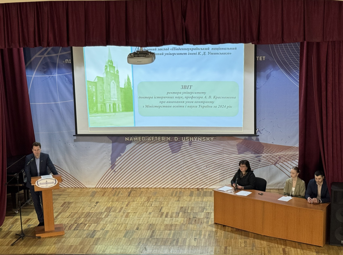 On January 30, 2024, a joint meeting of the Academic Council and the conference of the labor collective of the K. D. Ushinsky South Ukrainian National Pedagogical University was held in the assembly hall, at which the Rector, Doctor of Historical Sciences, Professor Andrii Krasnozhon reported on the implementation of the contract and the achievement of the University's target indicators for 2024.