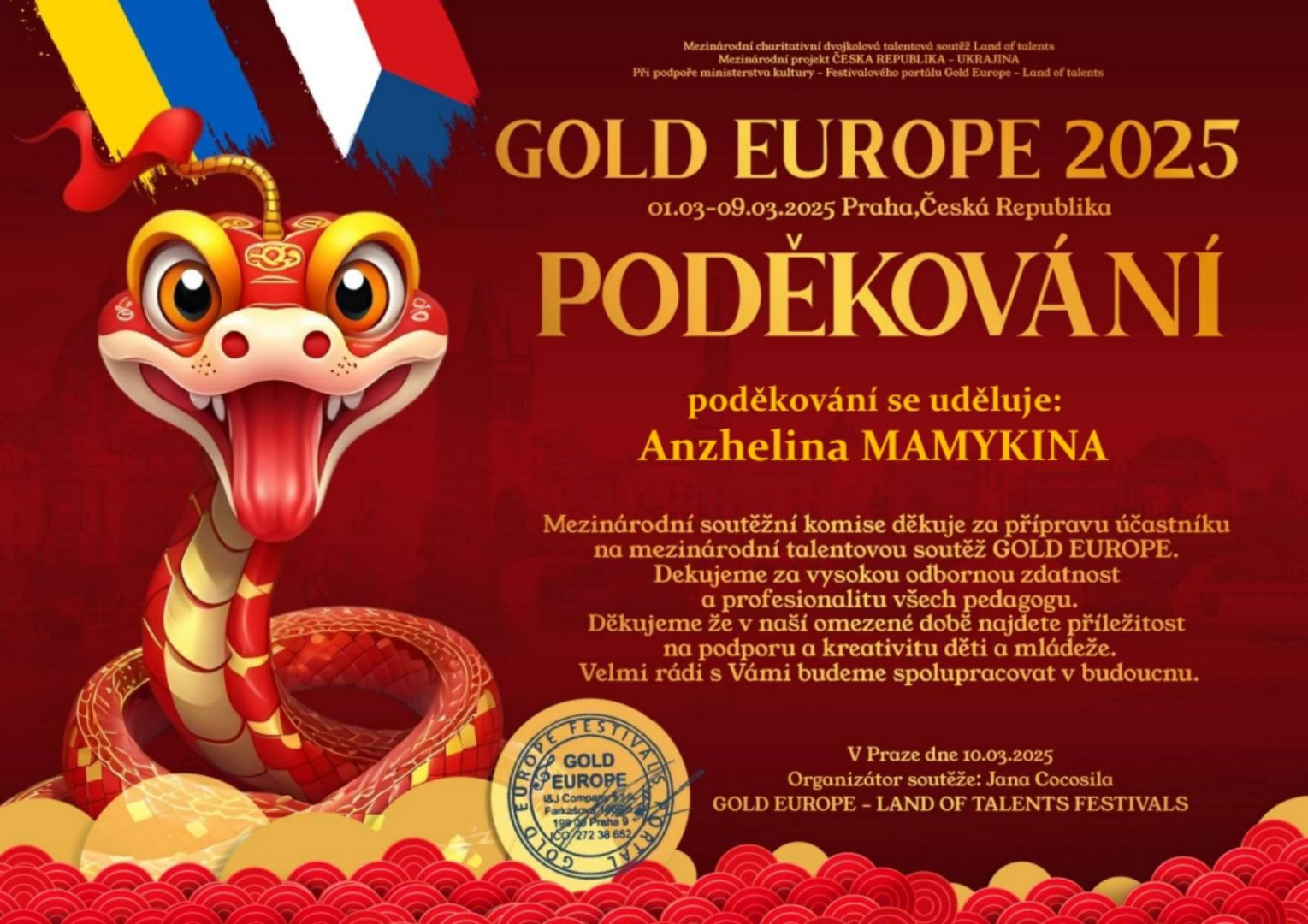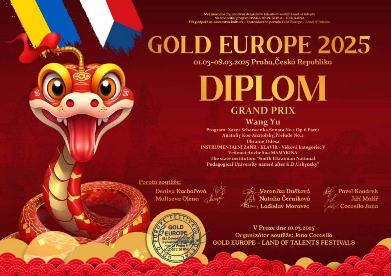 Bright victories and prizes were won by students of the Department of Musical and Instrumental Training in the art festivals-competitions held in March 2025. In the nomination "Instrumental Genre", the highest awards of the Grand Prix were received by: a graduate of the second (master's) level of higher education Zhai Chan (class of Professor Alla LINENKO) at the International two-round festival-competition "STAR SPACE", which was held in Kyiv, and a graduate of the second (master's) level of education in the specialty 025 Musical Art Wang Yu (class of Senior Lecturer Angelina MAMYKINA) at the International two-round art competition "GOLD EUROPE 2025", which was held in Prague (Czech Republic) with the support of the Ministry of Culture and the Public Organization Gold Europe Festivals.