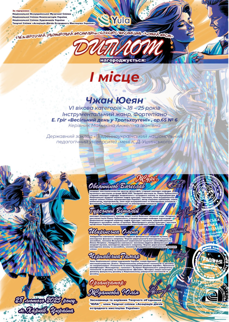 The 1st degree diploma was received by Zhang Yueyan, a student of the second (master's) level of education in the specialty 025 Musical Art (class of senior lecturer Angelina MAMYKINA) at the 5th International two-round festival-competition of arts "Fever Fest", which was held in Kharkiv.