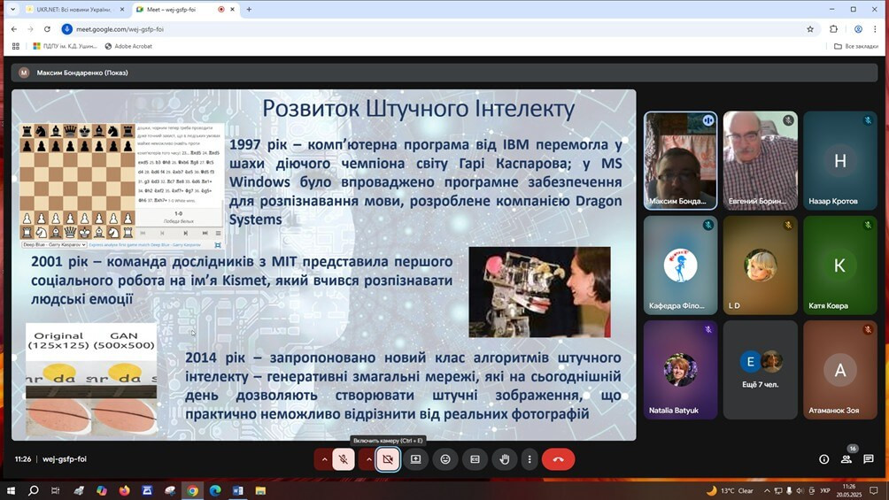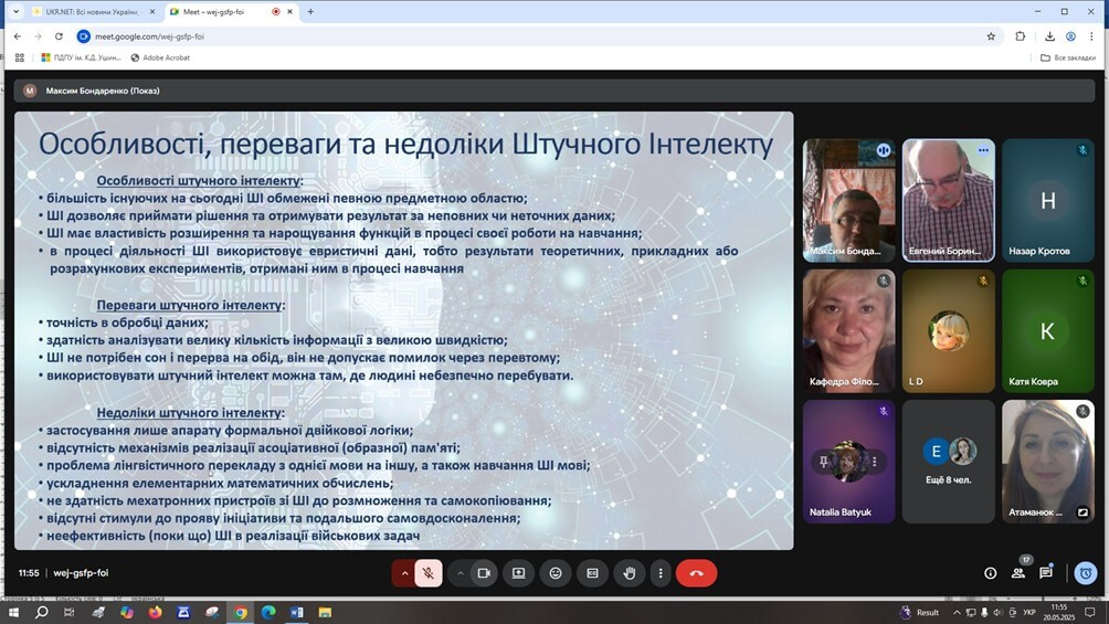 On May 20, the Round Table “Artificial Intelligence and Fantasy Naming” was held at Ushynsky University. The round table was organized by the Department of Philosophy, Sociology and Management of Ushynsky University and was dedicated to Science Day, Banker’s Day and HR Manager’s Day and was held as part of the meeting of the “School of Logistics”. The students majoring in 028 Management of Socio-Cultural Activities of 1-4 years, postgraduate students majoring in 033 of Ushynsky University, students of the National University “Odesa Law Academy”, Odesa National Economic University, Cherkasy State Technological University took an active part in organizing the round table. The report “The Importance of Artificial Intelligence for Modern Media” was delivered by the Dean of the Faculty of Journalism of NU “OLA”, Doctor of Philosophy, Professor Olena Skalatska. The problematic issues of AI were raised in the discussion speech “Artificial Intelligence – a panacea or a threat to humanity?” by Doctor of Technical Sciences, Professor, Head of the Department of Instrumentation, Mechatronics and Computer Technologies of ChSTU Maksym Bondarenko. He was supported in his project “Artificial Intelligence Trends 20-25” by a third-year postgraduate student majoring in 033 Philosophy of Ushynsky University Lyudmila Gorodnyuk. The specifics of fantasy naming and its combination with new opportunities for innovation thanks to artificial intelligence were presented in the report “Fantasy Naming: How to Make Money” by Doctor of Philosophy, Professor, Head of the Department of Philosophy, Sociology and Management of Socio-Cultural Activities of Ushynsky University Yevgen Borinshtein.