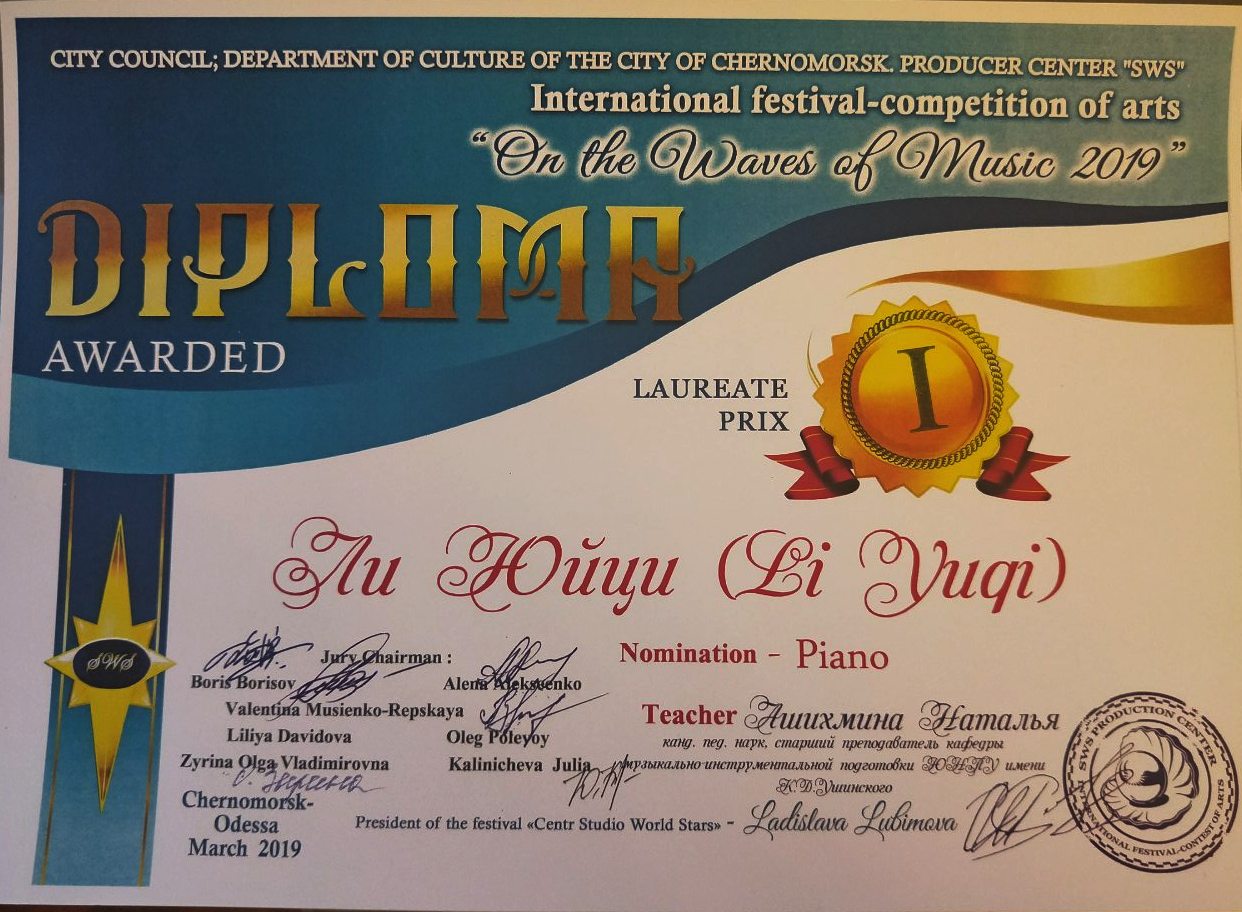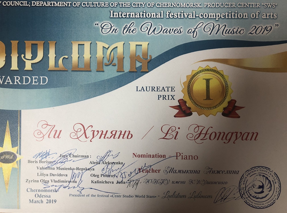 March 23-24, 2019, the International Festival-Competition "On the Waves of Music 2019" was held in the Black Sea region of Odesa region, where the students of the Faculty of Music and Choreography of Ushynsky University took part and became winners. In the nomination "Instrumental genre", Li Hunyan (class of senior trainer A. I. Mamykina) and Lee Yuji (class of senior trainer N. B. Ashhimina) took the 1st place.
