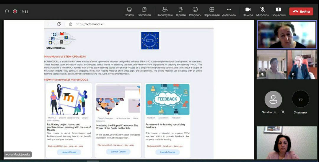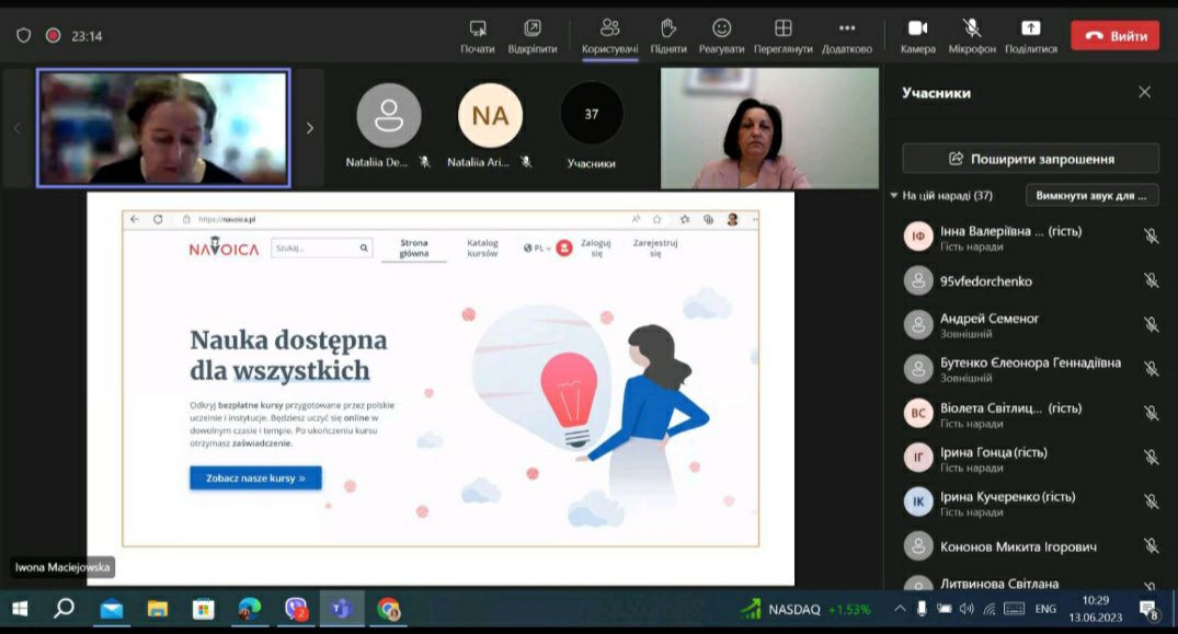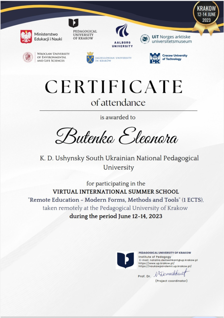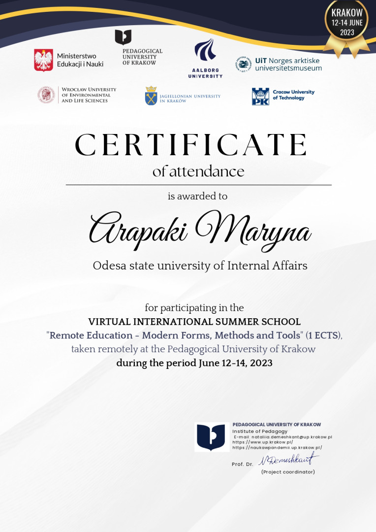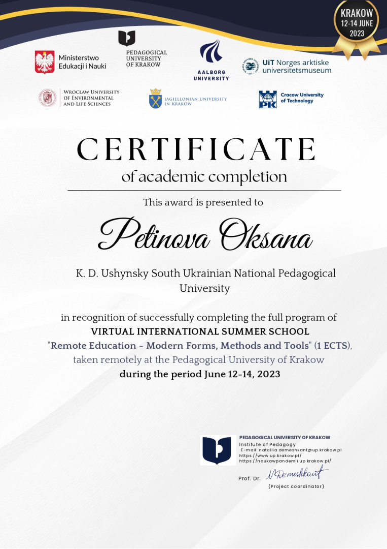 У червні 2023 року здобувачі третього (освітньо-наукового) рівня вищої освіти ОНП «Філософія» (Марина Арапакі, Віолета Світлицька, Інна Федорова, Елеонора Бутенко та інші) пройшли онлайн теоретико-методологічне й практичне навчання у віртуальній літній міжнародній школі за програмою «Remote Education – Modern Forms, Methods and Tools» на базі Краківського педагогічного університету при підтримці партнерів – ЗВО Польщі, Данії та Норвегії, під час якого опановували цифрові інструменти, що використовуються під час організації освітнього процесу та, зокрема, дистанційного навчання.Приділено увагу історичному ретроспективному аналізу технічної підтримки освіти та датському ігровому досвіду навчання, проаналізовано дидактичні деталі та кращі міжнародні практики, представлено переваги Moodle та активних дистанційних інструментів, розглянуто освітні проєкти EdTech. Під час практичних занять учасники були поділені на групи для тестування цифрових інструментів та обговорення дидактичних питань, кожна група працювала над підготовкою групових презентацій. Серед спікерів – провідні НПП ЗВО: Pedagogical University of Krakow (Poland), UiT (Norway), Aalborg University (Denmark), Jagiellonian University (Poland), Krakow University of Technology (Poland), Wroclaw University of Environmental and Life Sciences (Poland). Програма сприяла набуттю здобувачами компетентностей та РН ОНП, зокрема, ЗК 03. Здатність працювати в міжнародному контексті; СК 04. Здатність здійснювати науково-педагогічну діяльність у вищій освіті; ПРН 07. Застосовувати сучасні інструменти і технології пошуку, оброблення та аналізу інформації; ПРН 09. Організовувати і здійснювати освітній процес, його наукове, навчально-методичне та нормативне забезпечення, застосувати ефективні методики викладання навчальних дисциплін, та ін. Чекаємо на отримання сертифікатів!