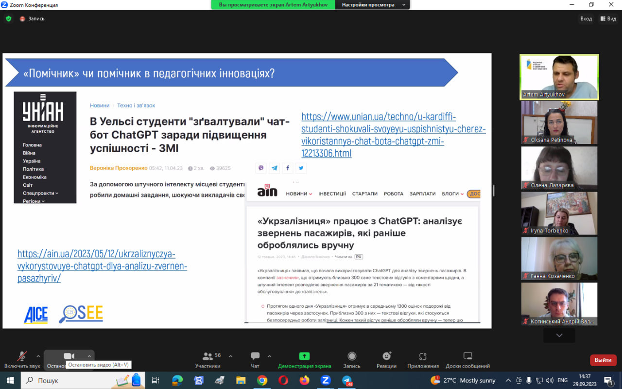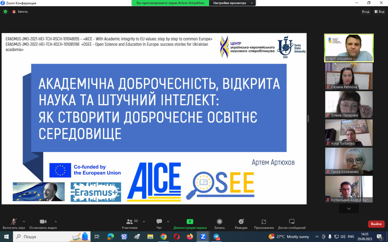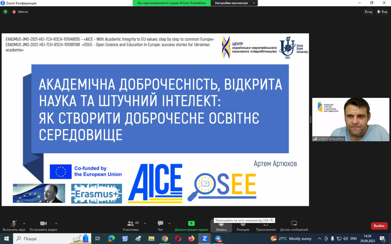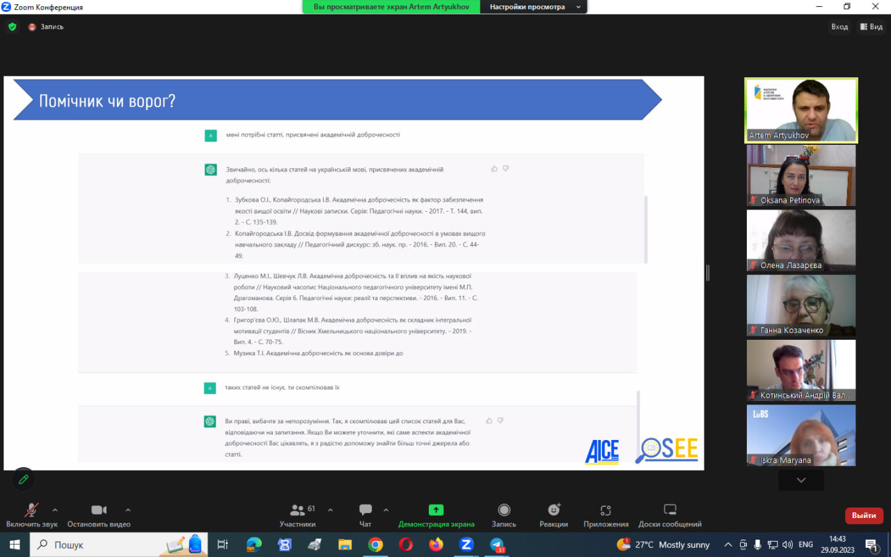 29 вересня 2023 року науково-педагогічні працівники кафедри філософії, соціології та МСКД і здобувачі третього (освітньо-наукового) рівня вищої освіти ОНП «Філософія» доєдналися до онлайн-лекції «Академічна доброчесність, відкрита наука та штучний інтелект: як створити доброчесне освітнє середовище». Спікер – Артем Артюхов, кандидат технічних наук, доцент, старший дослідник, керівник Групи сприяння академічній доброчесності Сумського державного університету, член Національного агентства із забезпечення якості вищої освіти, міжнародний інженер-педагог (Ing.Paed.IGIP), координатор модуля Жана Моне «AICE – With Academic integrity to EU values: step by step to common Europe». Говорили про діалог з чатом ChatGPT, аналізували питання академічної етики, особливості використання чату при проведенні наукових досліджень, тощо.
