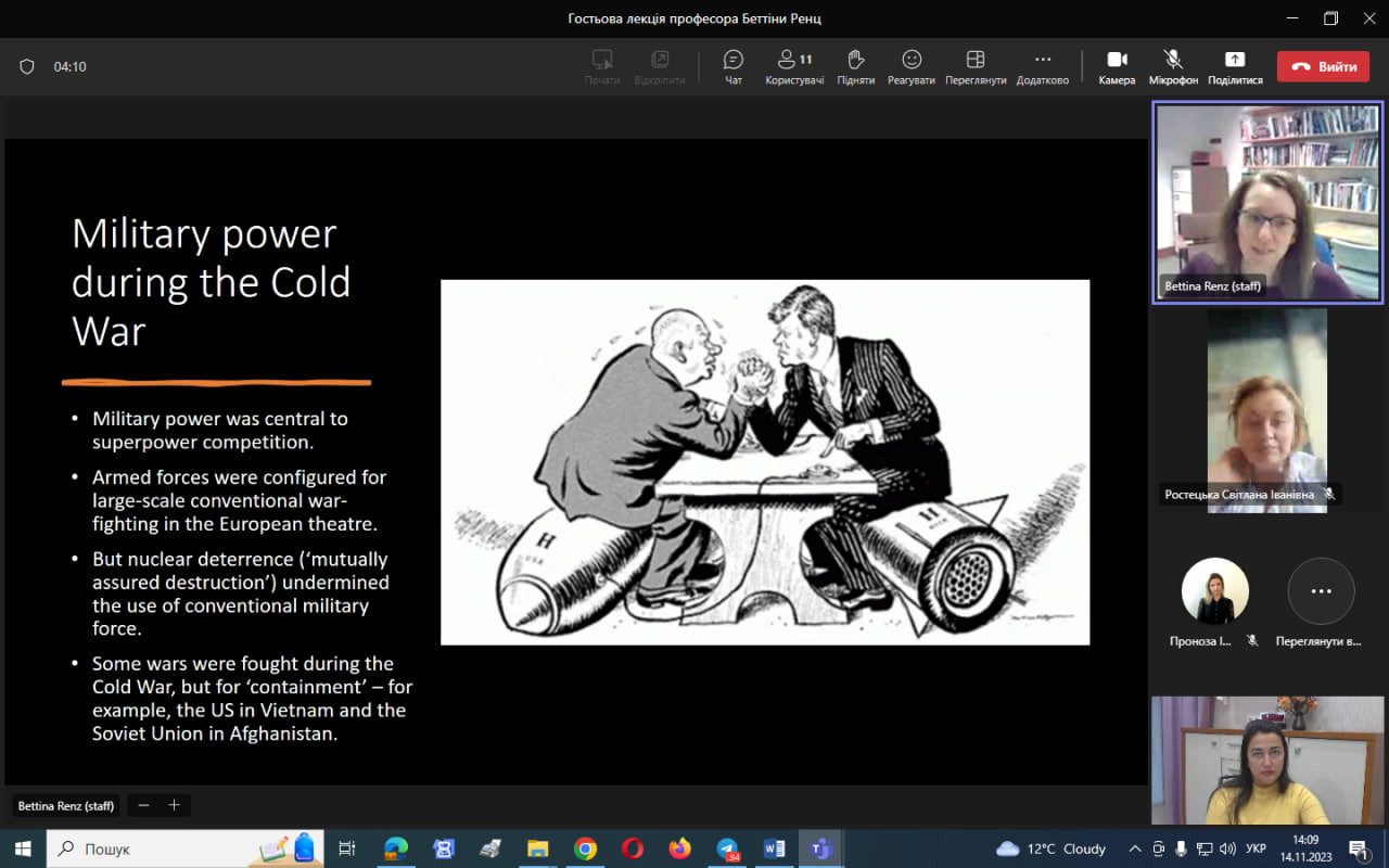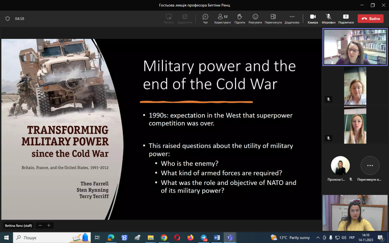 14 листопада 2023 року здобувачі третього (освітньо-наукового) рівня вищої освіти ОНП «Філософія» та Гарант ОНП мали можливість послухати відкриту гостьову лекцію професорки з міжнародної безпеки, Школи політики та міжнародних відносин Ноттінгемського університету (Велика Британія) Беттіни Ренц «Військова сила в ХХІ столітті: протиріччя в західній військовій думці», що проводилась у межах дисципліни «Політичні проблеми міжнародних систем та глобального розвитку (викладач – проф. Світлана Ростецька)», яка викладається для політологів.Надзвичайно актуальна тема в наш час об’єднала всіх небайдужих. Аналіз аспектів соціального насильства, війни та миру, сучасних поглядів на війну крізь призму глобалізації і багатополюсного світу сприяють формуванню уявлень про природу та змістову багатовимірність війни як соціального насильства.