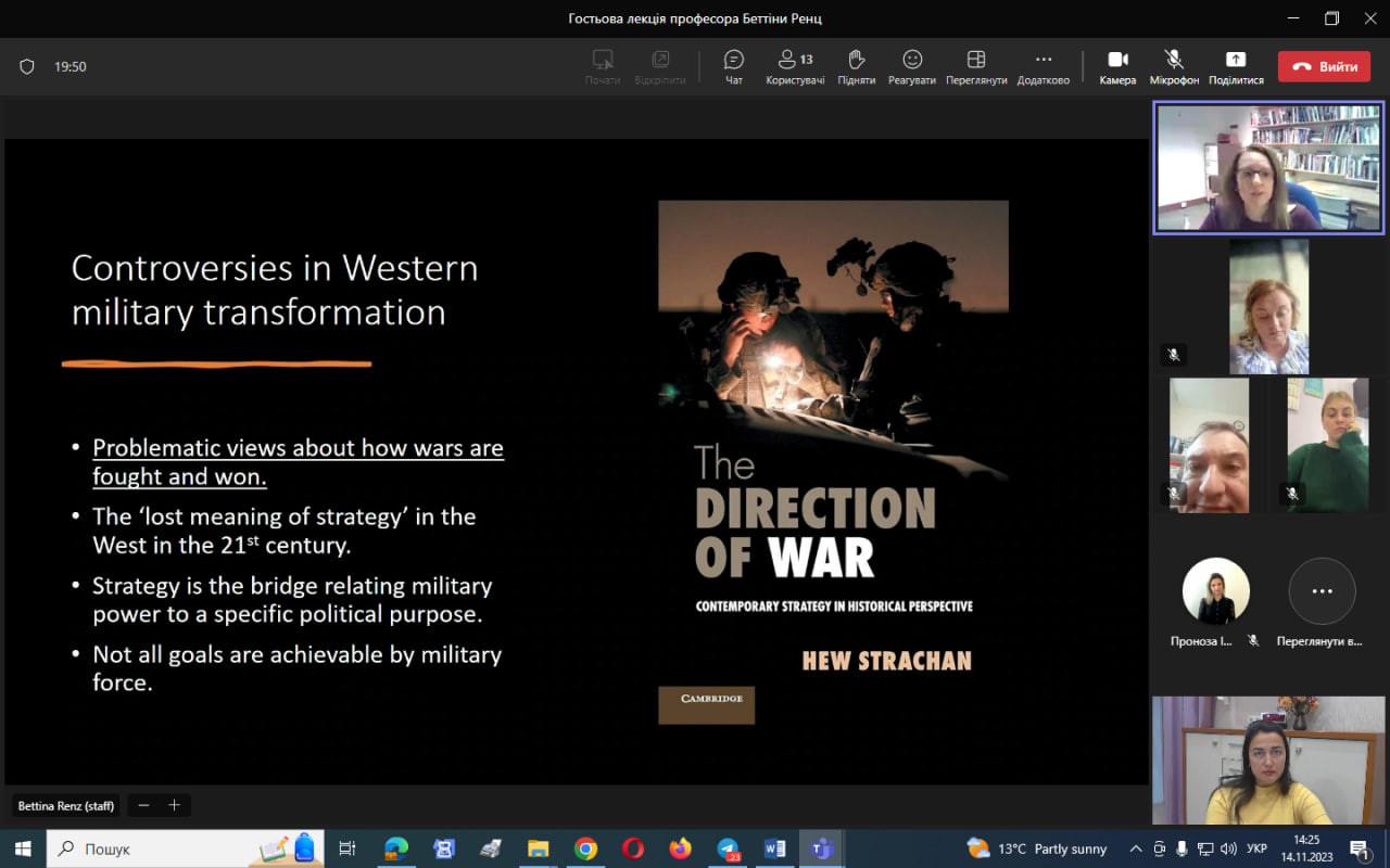 14 листопада 2023 року здобувачі третього (освітньо-наукового) рівня вищої освіти ОНП «Філософія» та Гарант ОНП мали можливість послухати відкриту гостьову лекцію професорки з міжнародної безпеки, Школи політики та міжнародних відносин Ноттінгемського університету (Велика Британія) Беттіни Ренц «Військова сила в ХХІ столітті: протиріччя в західній військовій думці», що проводилась у межах дисципліни «Політичні проблеми міжнародних систем та глобального розвитку (викладач – проф. Світлана Ростецька)», яка викладається для політологів.