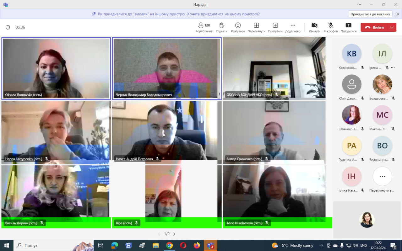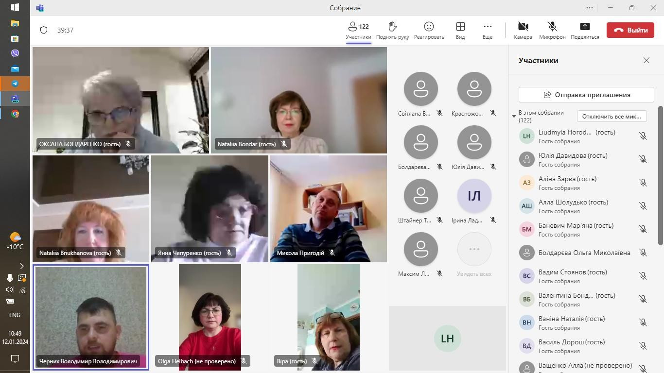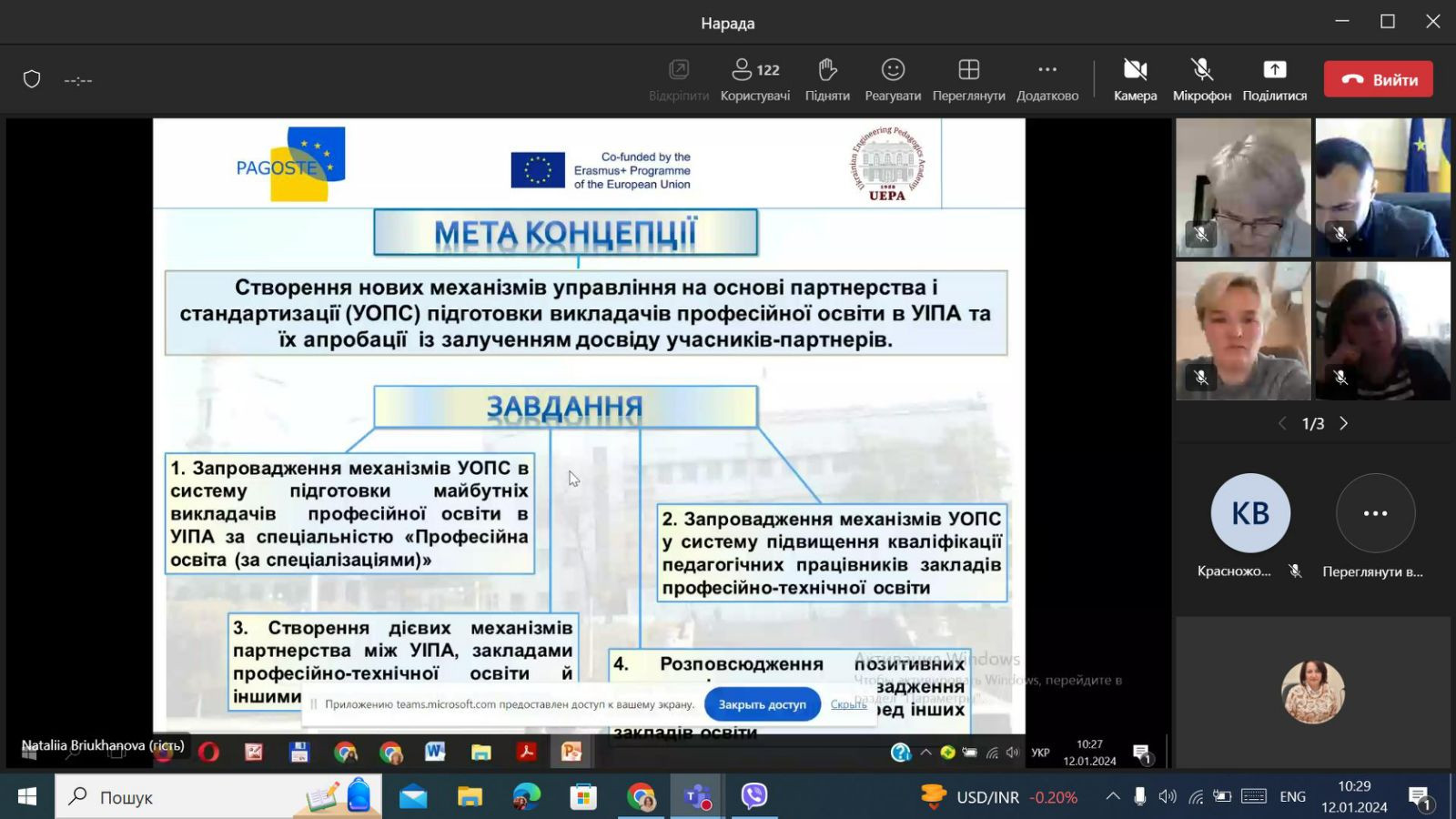 Здобувачі третього (освітньо-наукового) рівня вищої освіти ОНП «Філософія» Людмила Городнюк, Інна Федорова, Ігор Усатюк та Гарант ОНП проф. Оксана Петінова взяли участь у круглому столі «PAGOSTE: Результати та використання.Створення покрокової Інструкції з впровадження партнерського управління для ЗВО України» в межах плану сталого розвитку результатів проєкту Erasmus+ PAGOSTE «Нові механізми управління на основі партнерства та стандартизації підготовки викладачів професійної освіти в Україні», що був проведений 12 січня 2024 року Університетом Ушинського в онлайн форматі. На порядку денному – обговорення цінності робітничих професій у пілявоєнній відбудові країни, інноваційні методичні рекомендації, спрямовані на впровадження механізмів управління на основі партнерства та стандартизації у підготовку викладачів професійної освіти в Україні. Запропоновано онлайн платформу «Партнерський простір 015», що об'єднує заклади вищої освіти, професійної та фахової передвищої освіти, а також роботодавців. Цей інструмент відкриває нові можливості для взаємодії та співпраці між різними галузями освіти та бізнесу. Розглянуто кращі українські та європейські практики впровадження нових механізмів управління на основі партнерства. Захід був надзвичайно цікавим та актуальним в умовах сьогодення.