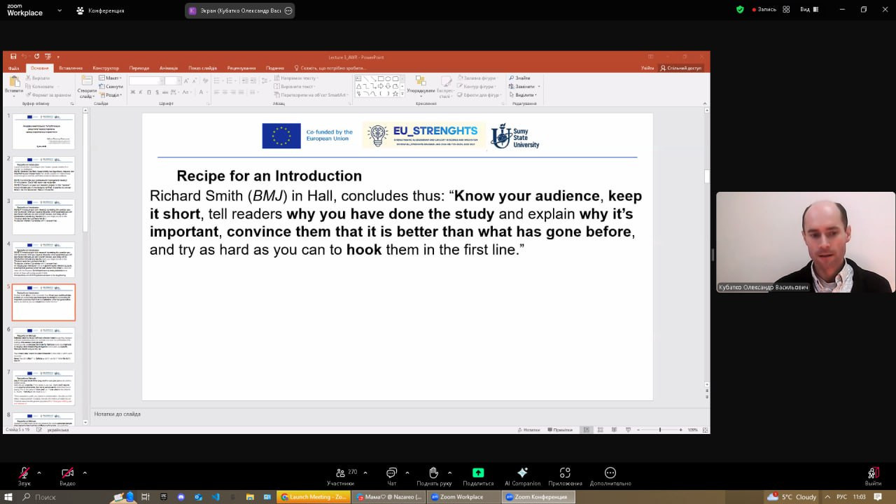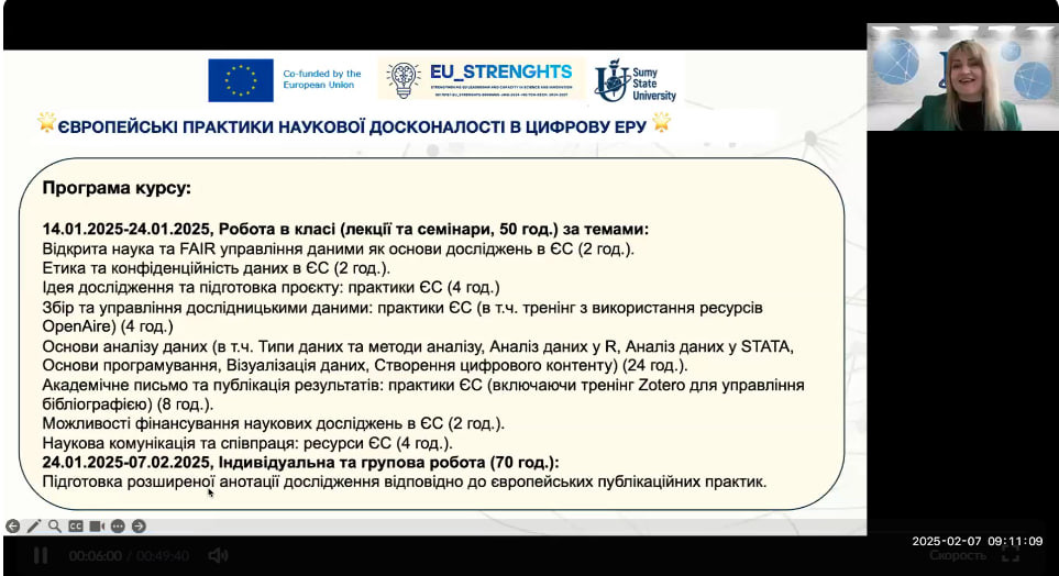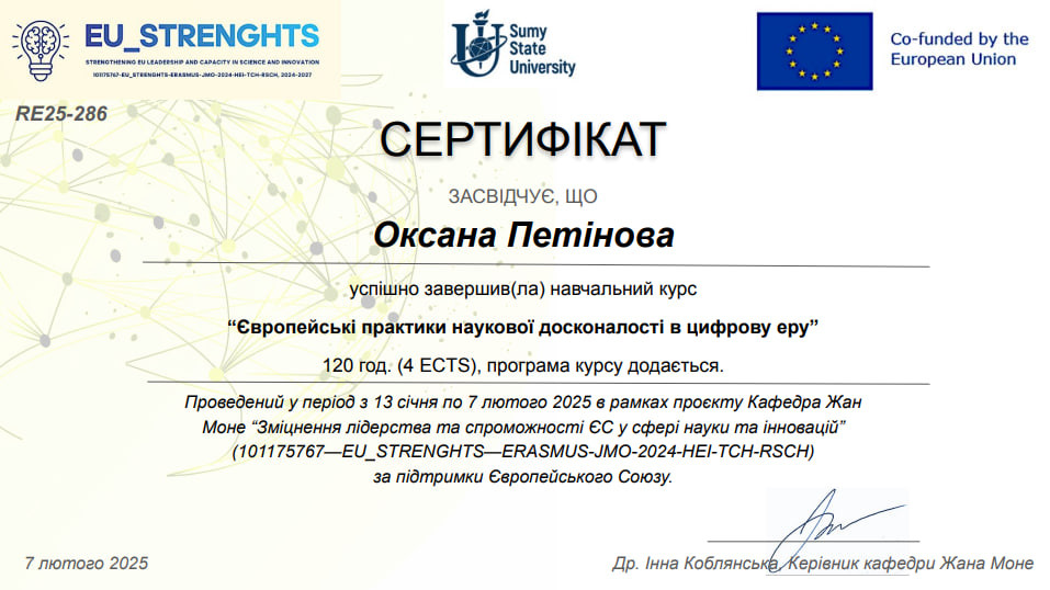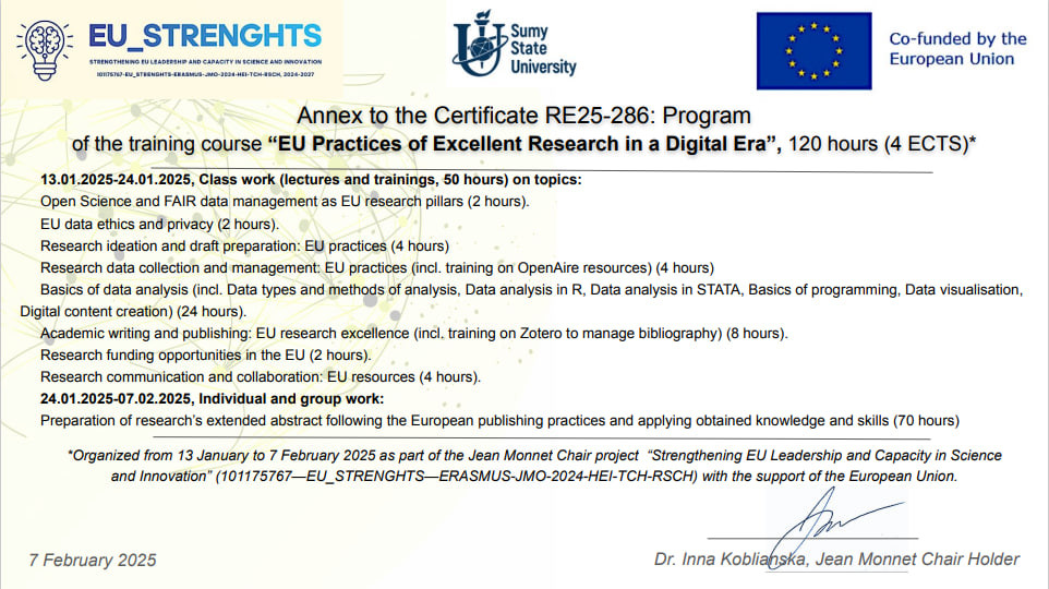 З 13 січня по 7 лютого 2025 року взято участь у курсі (4 ECTS), організованому в рамках проєкту Кафедра Жана Моне «Зміцнення лідерства та спроможності ЄС у сфері науки та інновацій» (101175767—EU_STRENGHTS—ERASMUS-JMO-2024-HEI-TCH-RSCH), що реалізується кафедрою економіки, підприємництва та бізнес-адміністрування Сумського державного університету під керівництвом к.е.н., доцента Інни Коблянської та фінансується Європейським Союзом. Під час курсу говорили про європейські підходи до відкритої науки та принципи FAIR-управління даними (Findable, Accessible, Interoperable, Reusable), що сприяє підвищенню прозорості та ефективності наукових досліджень; поглибили знання з етики наукових досліджень та конфіденційності даних, ознайомилися з європейськими вимогами щодо їхнього захисту та відповідального використання; опановували ключові методики підготовки наукових проєктів та написання грантових заявок відповідно до стандартів ЄС, що відкриває можливості для залучення міжнародного фінансування; отримали практичні навички роботи з дослідницькими даними – їх збору, управління та збереження, пройшли тренінги з використання сучасних цифрових інструментів, тощо. Програма курсу стала чудовою можливістю розширити компетентності в галузі сучасної науки, застосувати найкращі практики ЄС у власних дослідженнях. Розширення мережі професійних контактів сприятиме подальшій співпраці та реалізації спільних дослідницьких ініціатив. Висловлюю подяку організаторам за високий рівень змістовного наповнення курсу та відмінну організацію!