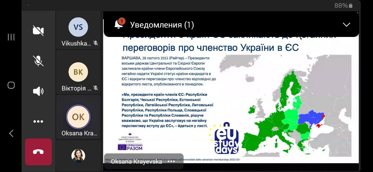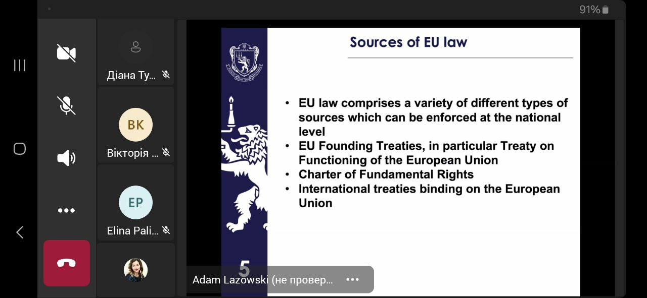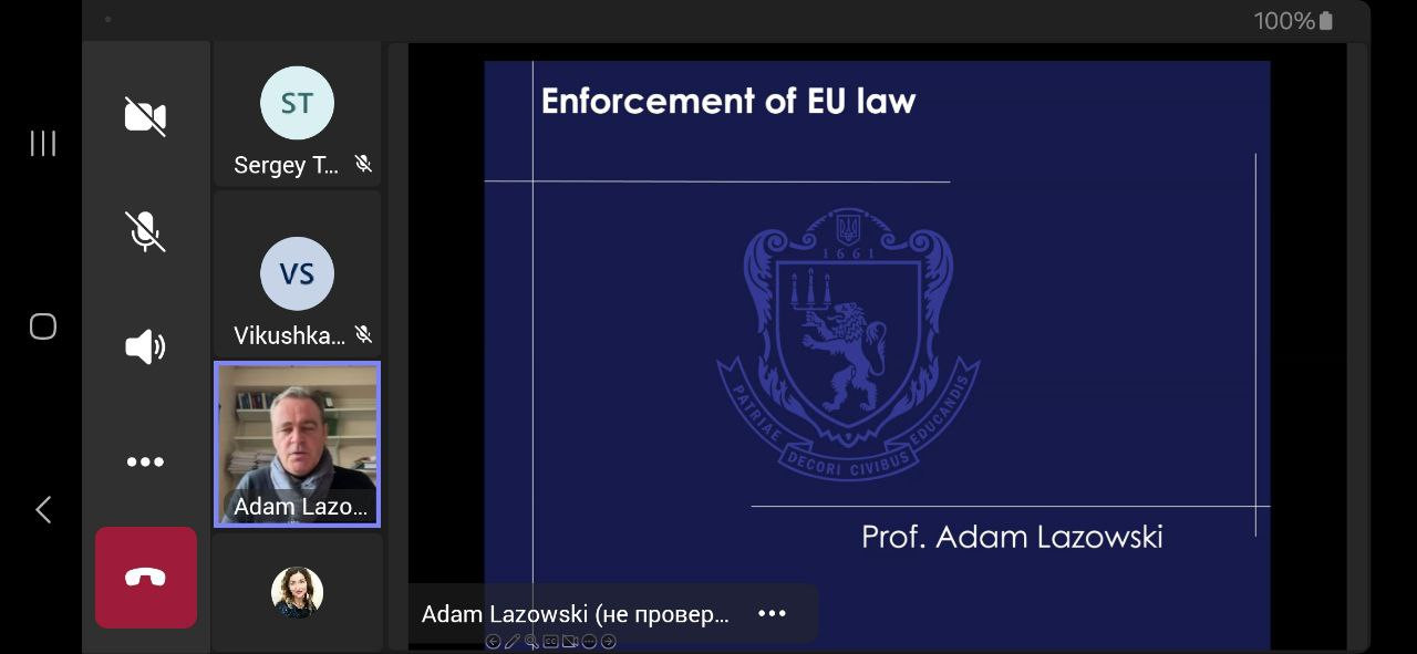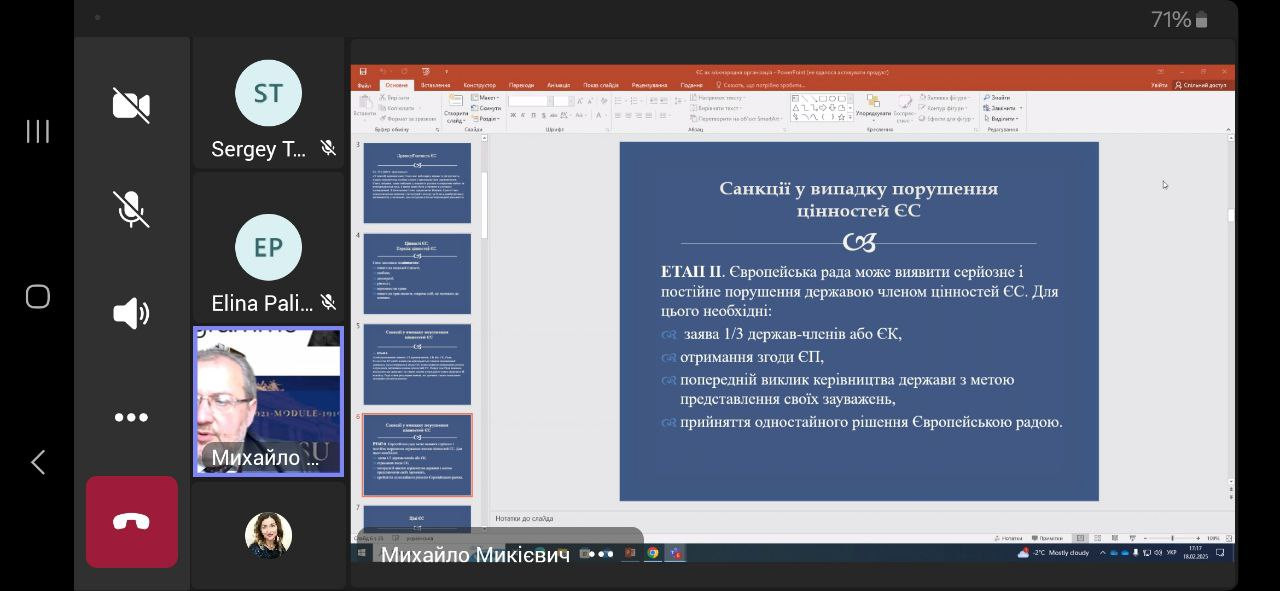 1Завершилась VII Зимова школа європейських студій, проведена в межах проєкту Erasmus+ EU4UA «Модернізація юридичної освіти для підтримки європейської та євроатлантичної інтеграції України», яка тривала з 17-21 лютого 2025 року.Вона стала важливою платформою для обговорення сучасних викликів євроінтеграції та міжнародних відносин. Долучення до школи стала можливістю осмислення філософських аспектів європейської інтеграції, правової культури та демократичних процесів. Зокрема, дискусії про природу права ЄС, взаємодію національного та європейського законодавства та регулювання соціальної політики дозволили розширити розуміння ключових принципів правової філософії та їхнього впливу на формування суспільних інститутів. Особливий інтерес викликали теми демократії в ЄС та протидії пропаганді й дезінформації, що сприяло аналізу ролі критичного мислення та медіаграмотності в сучасному світі. Серед спікерів школи - відомі фахівці та професіонали: Оксана Головко-Гавришева – керівник Західноукраїнського наукового центру європейських студій; Адам Лазовскі – професор права ЄС, Вестмінстерський університет (Лондон), Михайло Микевич – професор, завідувач кафедри європейського права Львівського університету та інші науковці.