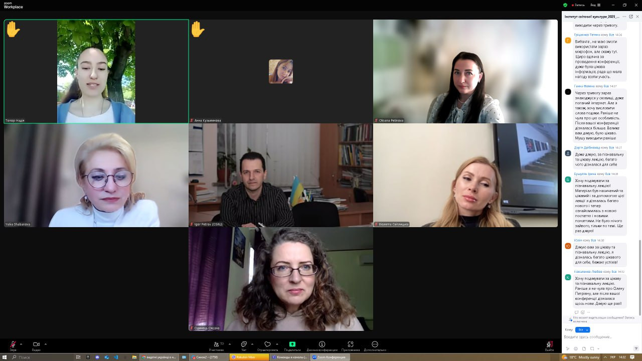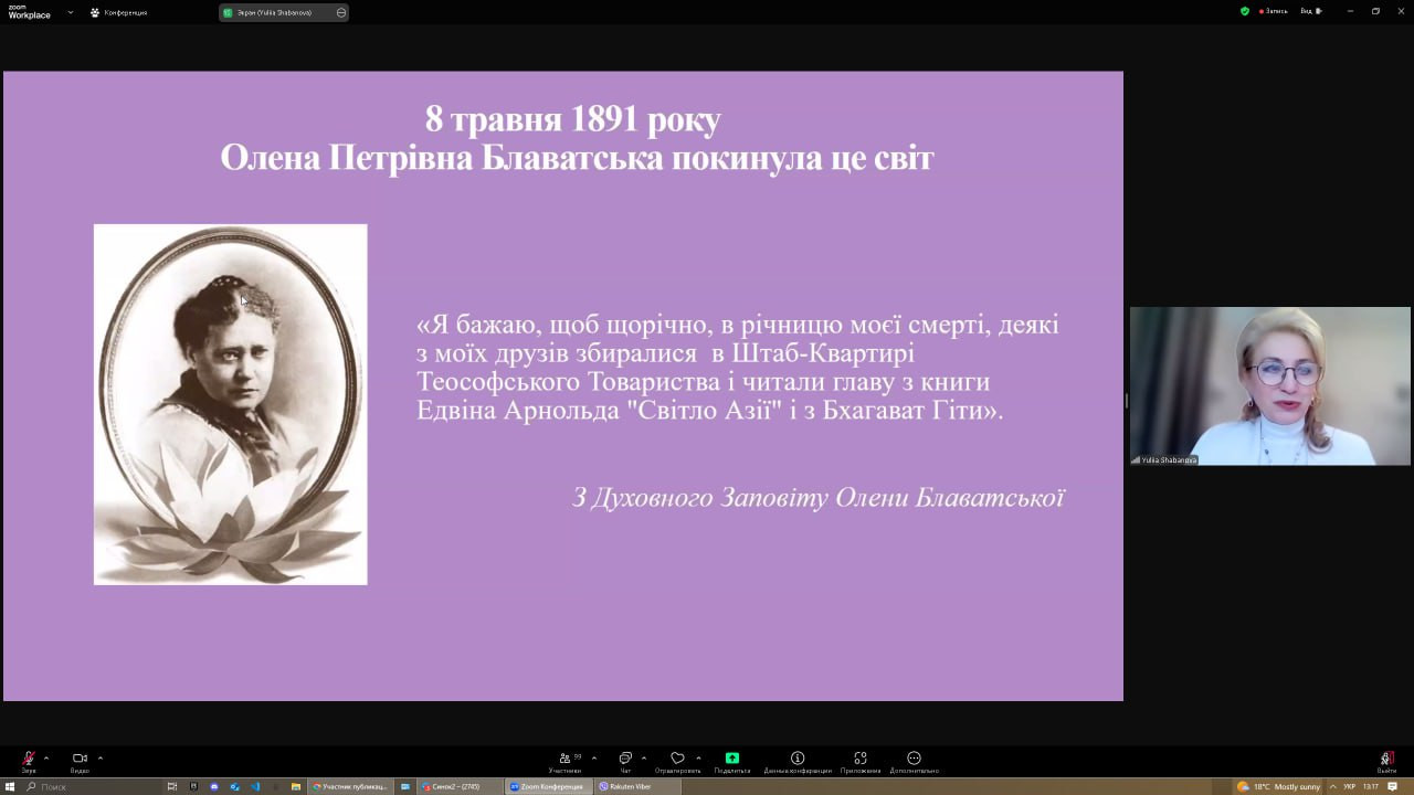 138 квітня 2025 року науково-педагогічні працівники кафедри, аспіранти, студенти спеціальності 028 «Менеджмент соціокультурної діяльності» та 013 «Початкова освіта» долучилися до онлайн-зустрічі, що була проведена у межах програми «Гостьовий лектор» на запрошення доц. Тетяни Поплавської, і присвячена визначній постаті світової духовної культури – Олені Блаватській.Спікер – д. філос. н., професор, директор Науково-дослідницького центру «Інститут світової культури» Дніпровської академії музики Юлія Шабанова. Захід зібрав понад 100 учасників, охочих долучитися до розуміння філософської спадщини однієї з найвпливовіших жінок ХІХ століття. Під час зустрічі ознайомилися з ключовими працями, основними ідеями філософських концепцій, віртуально відвідали музей, присвячений її життю і творчості. Захід приурочено до Дня Білого Лотоса – дати, яка щорічно відзначається вшануванням пам’яті Олени Петрівни, як символа духовного просвітлення, гуманізму та пошуку істини. Окремо хочеться відзначити учасників студентського наукового гуртка «Південноукраїнські наукові студії» (керівник — проф. Оксана Петінова). Юліана Варшавська, Муся Анастасія та Вікторія Діденко не лише взяли активну участь у жвавій дискусії, але й поділилися власними аналітичними міркуваннями. Як визнання їхнього інтелектуального внеску, Юлія Олександрівна надіслала студенткам свої авторські монографії «Теософія: історія та сучасність», які було урочисто вручено. Аспіранти ОНП «Філософія» активно розмірковували щодо карми, духовного розвитку, хронік Акаші, цікавилися проблематикою зустрічей теософського товариства, членами якого є Юлія Олександрівна та Тетяна Миколаївна. Серед найбільш активних – Інна Федорова, Віолета Світлицька та Людмила Городнюк. З нагоди свята бібліотеці кафедри презентовано наукові та навчально-методичні праці, які займуть чинне місце серед літератури сучасних науковців у нашій колекції. Щиро дякуємо за надзвичайні враження, змістовну лекцію та атмосферу інтелектуального збагачення. Такі події надихають на глибші пошуки, відкривають нові горизонти та залишають у серці світло.