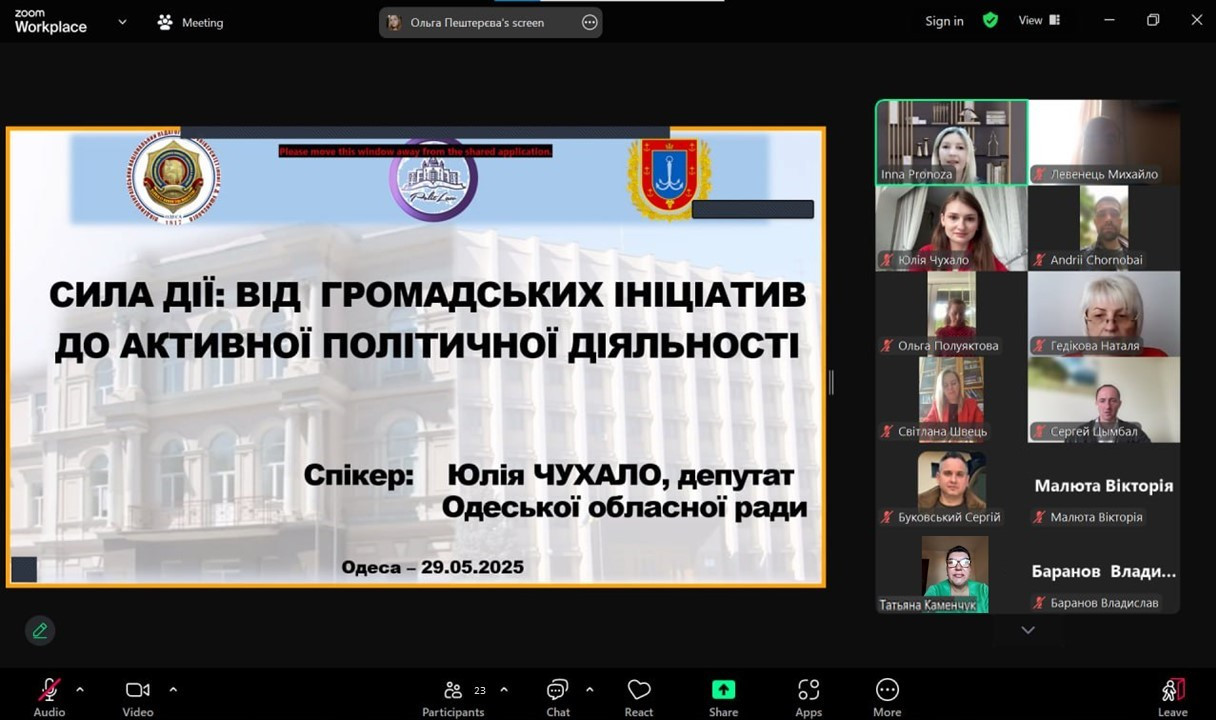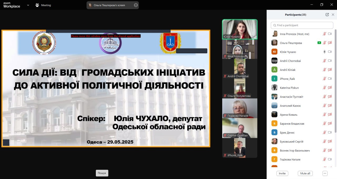 29 травня 2025 року в межах програми «Гостьовий лектор» для здобувачів усіх рівнів спеціальності С2 Політологія відбувся онлайн-практикум із професіоналом-практиком, стейкхолдером освітніх програм — Юлією ЧУХАЛО, депутаткою Одеської обласної ради, керівницею депутатської групи жінок «Рівні можливості», заступницею голови комісії з питань охорони здоров’я та соціальної політики.
