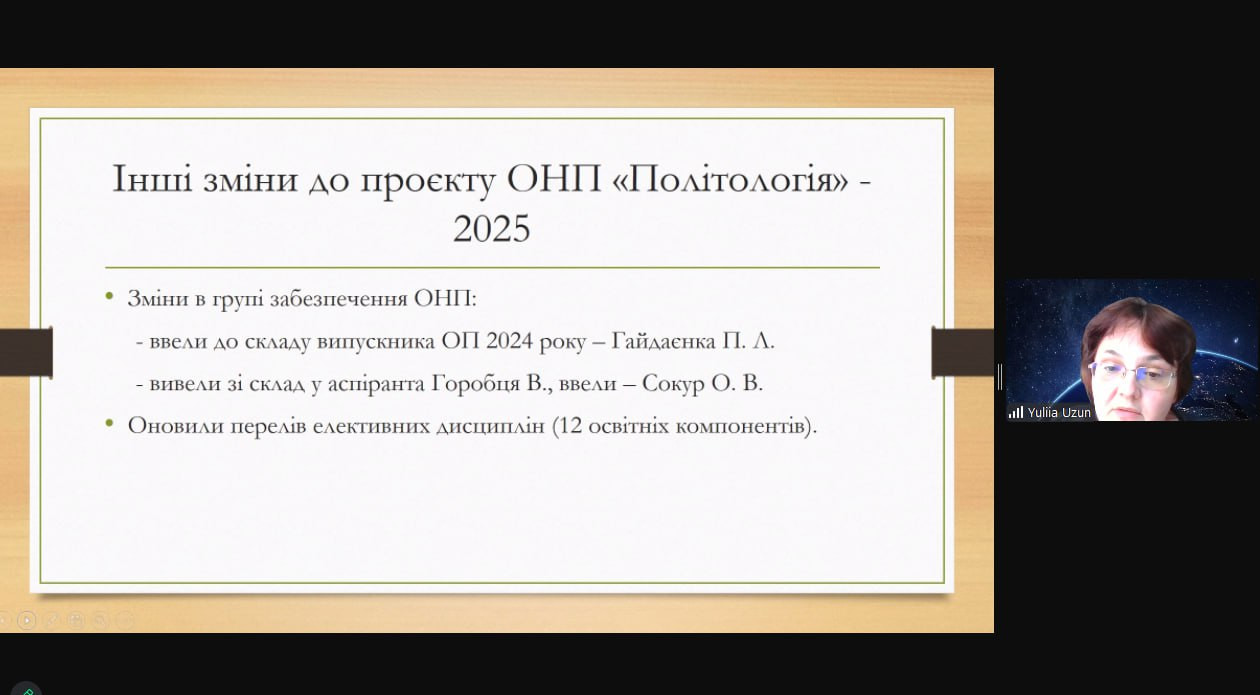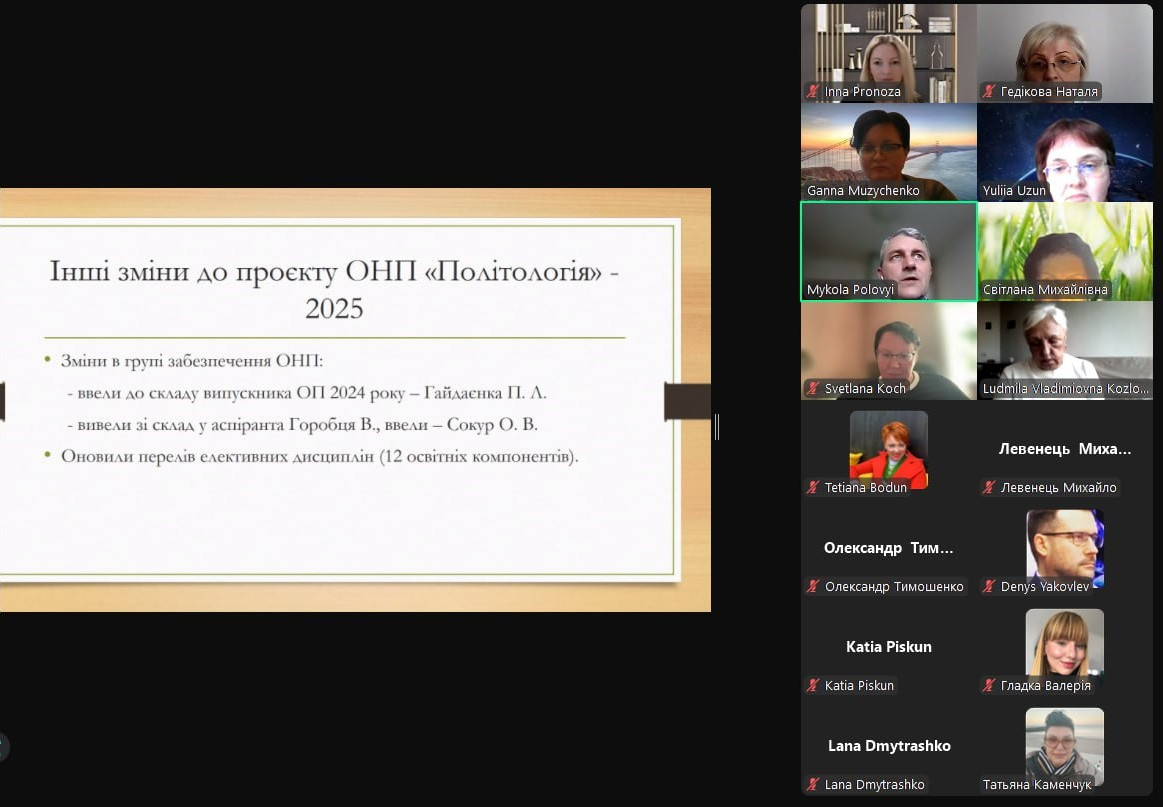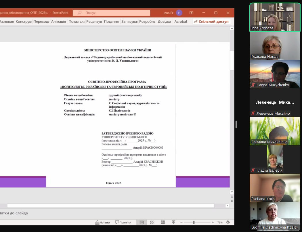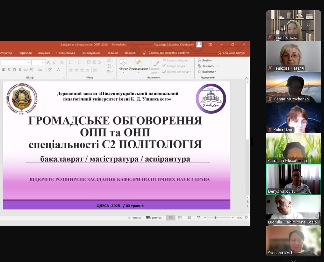 03 червня 2025 року на розширеному засіданні кафедри політичних наук і права Університету Ушинського відбувся заключний етап громадського обговорення проєктів освітніх програм підготовки здобувачів вищої освіти усіх рівнів спеціальності С2 Політологія: