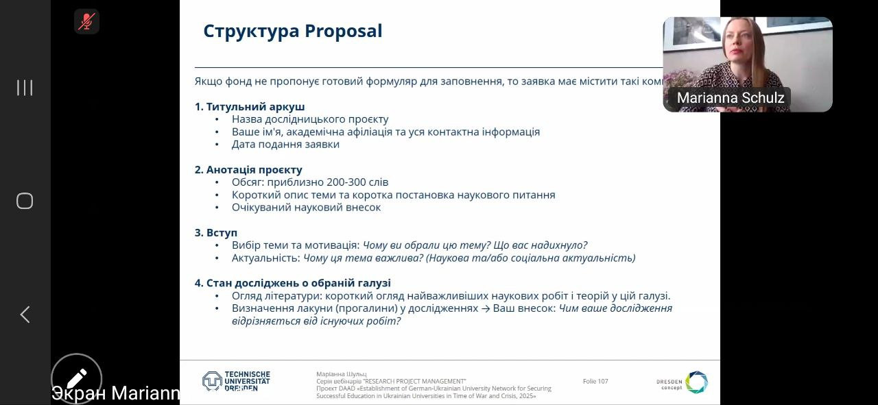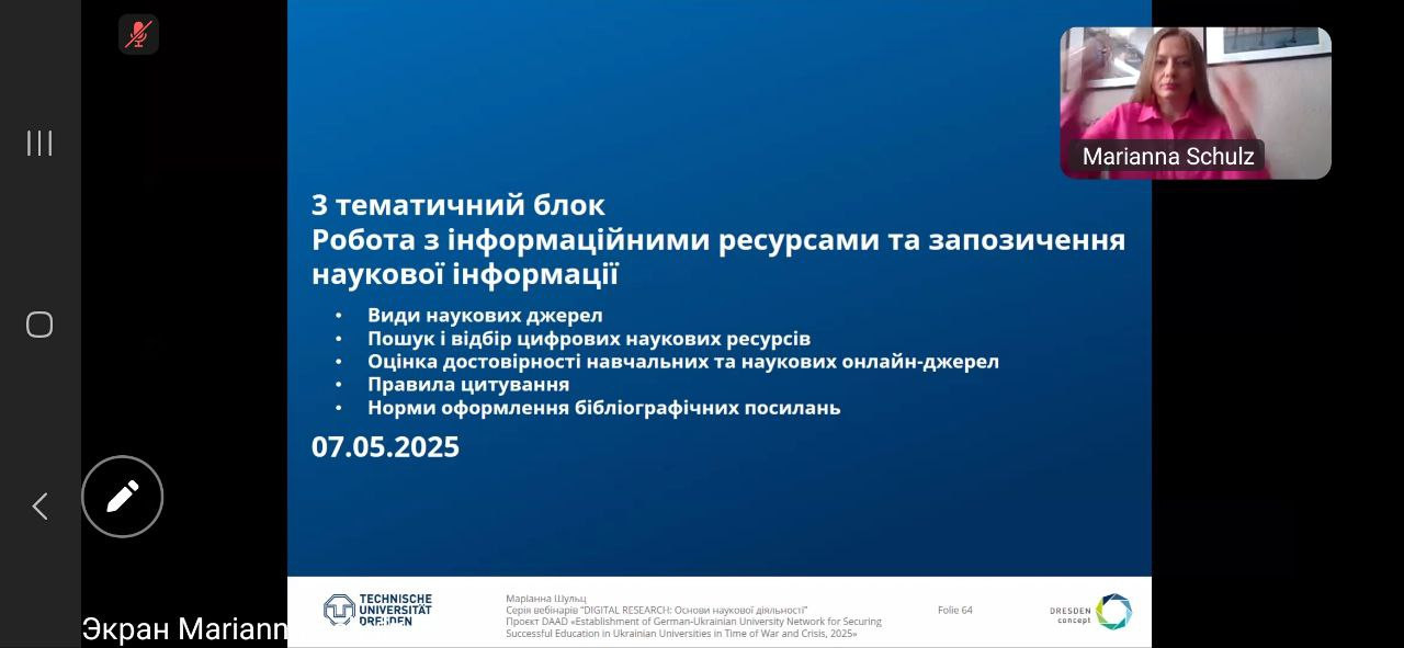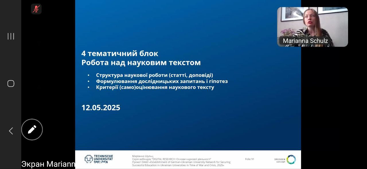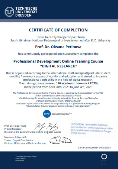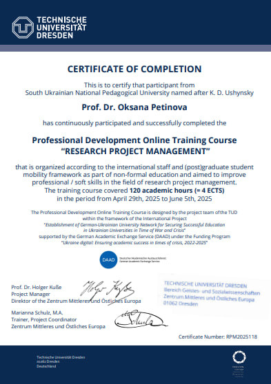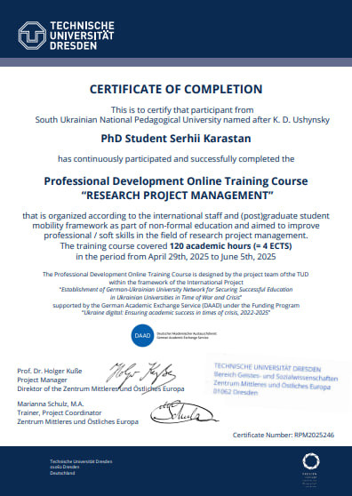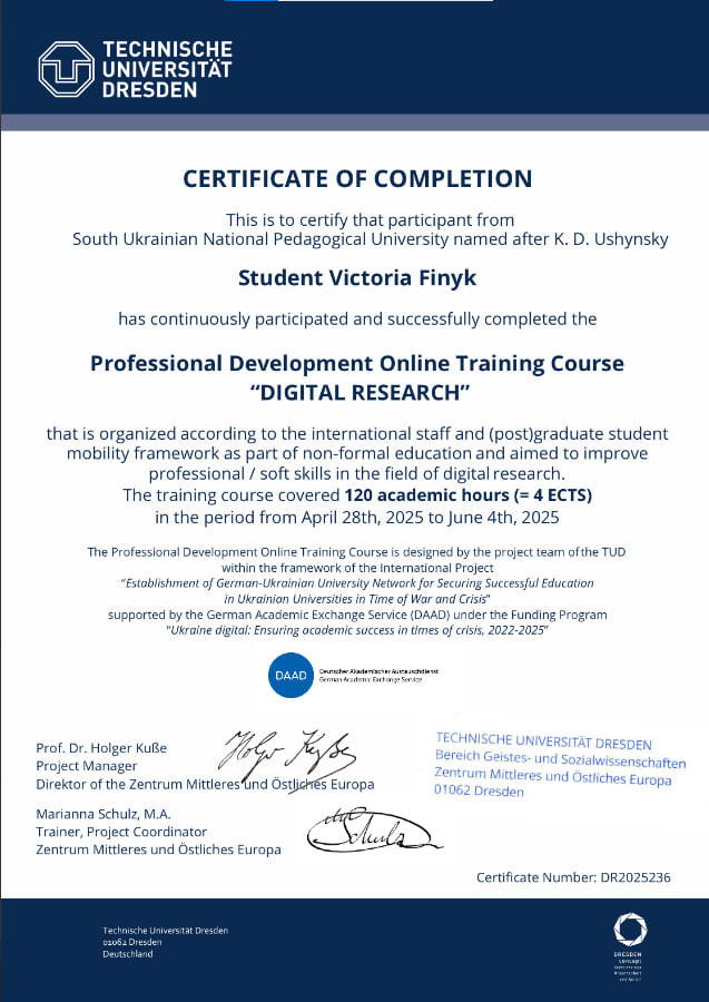 Здобувачі освіти ОПП «Менеджмент соціокультурної діяльності» Катерина Ковра, Вікторія Фіник, Полина Самойлова та ОНП «Філософія» Сергій Карастан та Микола Начев, а також науково-педагогічні працівники кафедри успішно завершили міжнародну мобільність в Технічному університеті Дрездена за програмами «Digital Research: Основи наукової діяльності» та «Research Project Management», мета яких – розвиток компетенцій у сфері організації та проведення наукових досліджень та реалізаціє проєктів студентами і молодими науковцями. Програма реалізується за підтримки Німецької служби академічних обмінів (DAAD) в рамках міжнародного проєкту «Establishment of German-Ukrainian University Network for Securing Successful Education in Ukrainian Universities in Time of War and Crisis» програми фінансування «Ukraine digital: Ensuring academic success in times of crisis, 2025». Дякуємо спікерці вебінарів Маріанні Шульц за високий професіоналізм, позитивну атмосферу та міжкультурну комунікацію! Участь наших здобувачів у міжнародних ініціативах не лише розширює їхній професійний горизонт, а й підтверджує, що наші освітні програми кафедри готують фахівців нового покоління – мобільних, етичних, креативних і здатних діяти в умовах глобальної нестабільності. З нетерпінням чекаємо нових зустрічей.