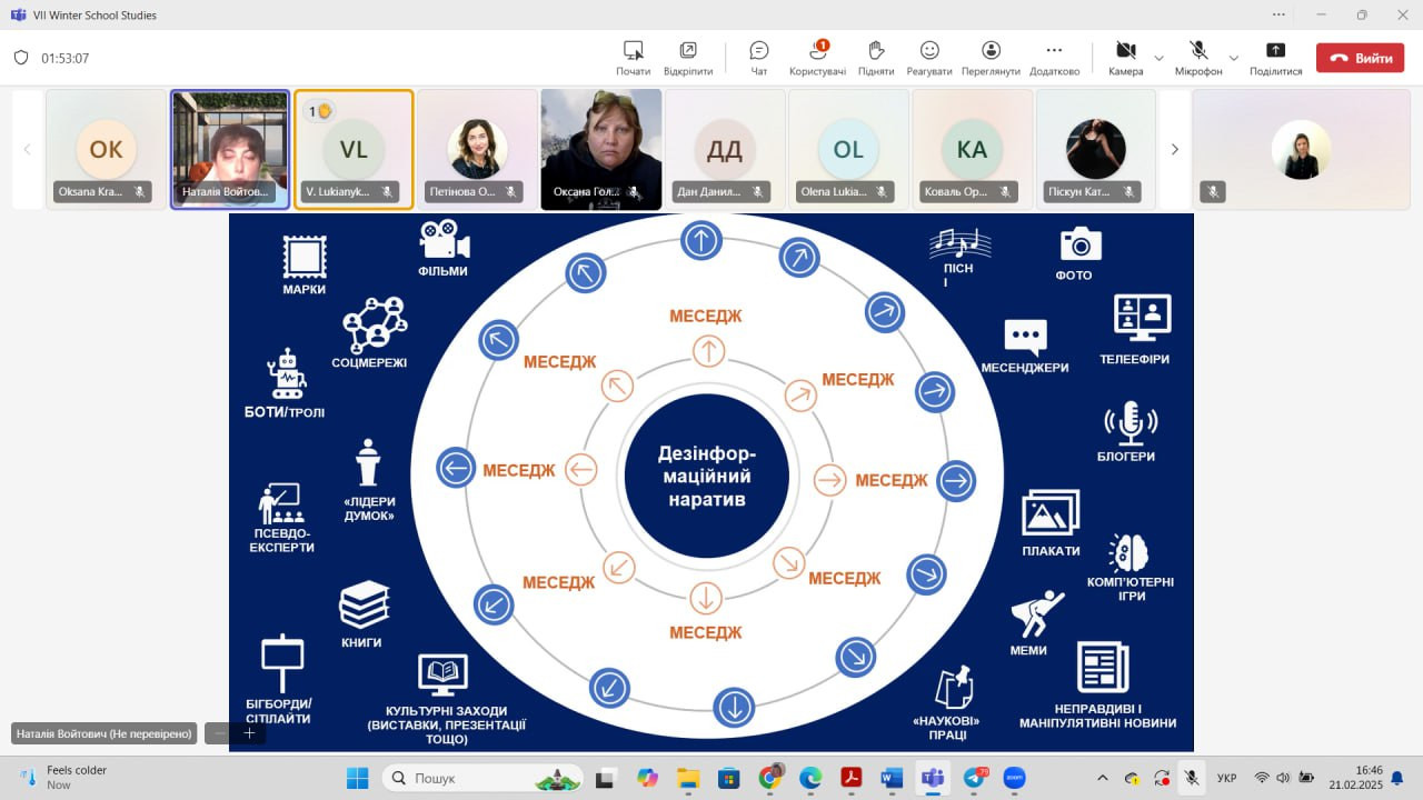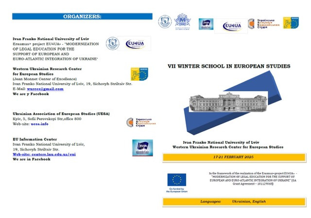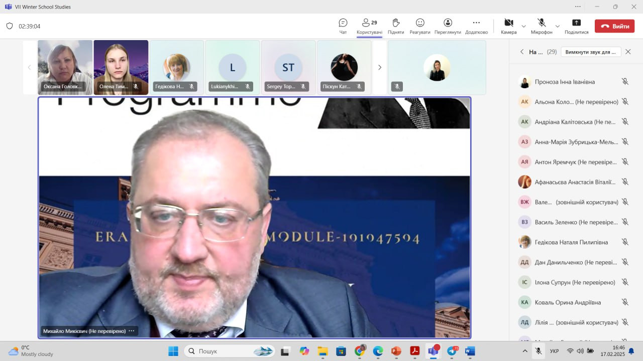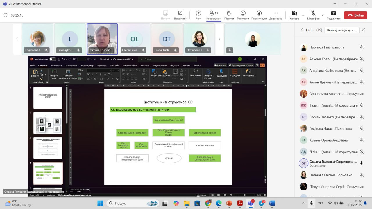 1Викладачі кафедри політичних наук і права: доцент Інна Проноза, професор Наталя Гедікова та старший викладач Світлана Швець разом зі здобувачами-магістрами освітньої програми «Політологія. Українські та європейські політичні студії» пройшли навчання у VII Зимовій школі європейських студій.Це навчання відбулося в рамках проєкту Erasmus+ EU4UA «Модернізація юридичної освіти для підтримки європейської та євроатлантичної інтеграції України» та дозволило слухачам по завершенню навчання отримати сертифікати (2 кредити ECTS) і відповідно будуть зараховані як результати неформальної освіти у межах тем обов’язкових компонентів магістерської програми.