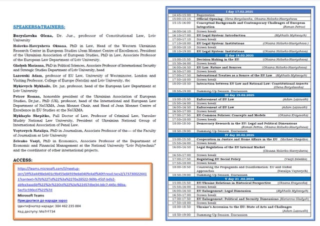 Заняття проводили провідні науковці та експерти у сфері європейських студій, серед яких Оксана Головко-Гавришева, Адам Лазовський, Михайло Микевич, Бориславська Олена, Роман Петров, Михайло Шепітько, Наталія Войтович та Василь Зеленко. Їхні лекції та дискусії сприяли розвитку критичного мислення, практичних навичок і розуміння політичних і правових механізмів, необхідних для роботи у сфері міжнародних проєктів та євроінтеграції.