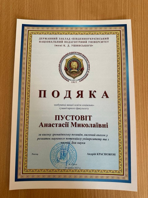 1Здобувачі другого (магістерського) рівня вищої освіти соціально-гуманітарного факультету Левенець Михайло, Таргоніна Марія, Пустовіт Анастасія отримали подяки за: