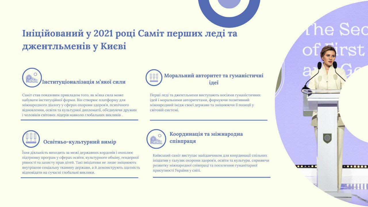 У сучасному світі відбуваються процеси трансформації, посилюються агресія і розбрат, однак гуманітарні ініціативи перших леді та джентльменів виявляються здатними впливати на політичний порядок денний. Перша леді України Олена ЗЕЛЕНСЬКА активно популяризує та реалізує міжнародну координацію освітніх, культурних ініціатив «м’яких дипломатів», перетворюючи гуманітарні питання на важливі складові міждержавних відносин. Діяльність перших леді та джентльменів є проявом нового типу лідерства, оскільки їх публічні дії, культурні й освітні проєкти укріплюють єдність та стійкість всередині країни, покращають імідж країни назовні. Пані Олена ЗЛЕНСЬКА використовує платформу щорічних самітів перших леді та джентльменів для обміну досвідом публічної дипломатії, перетворює на надзвичайно дієвий інструмент м’якої сили в умовах війни.