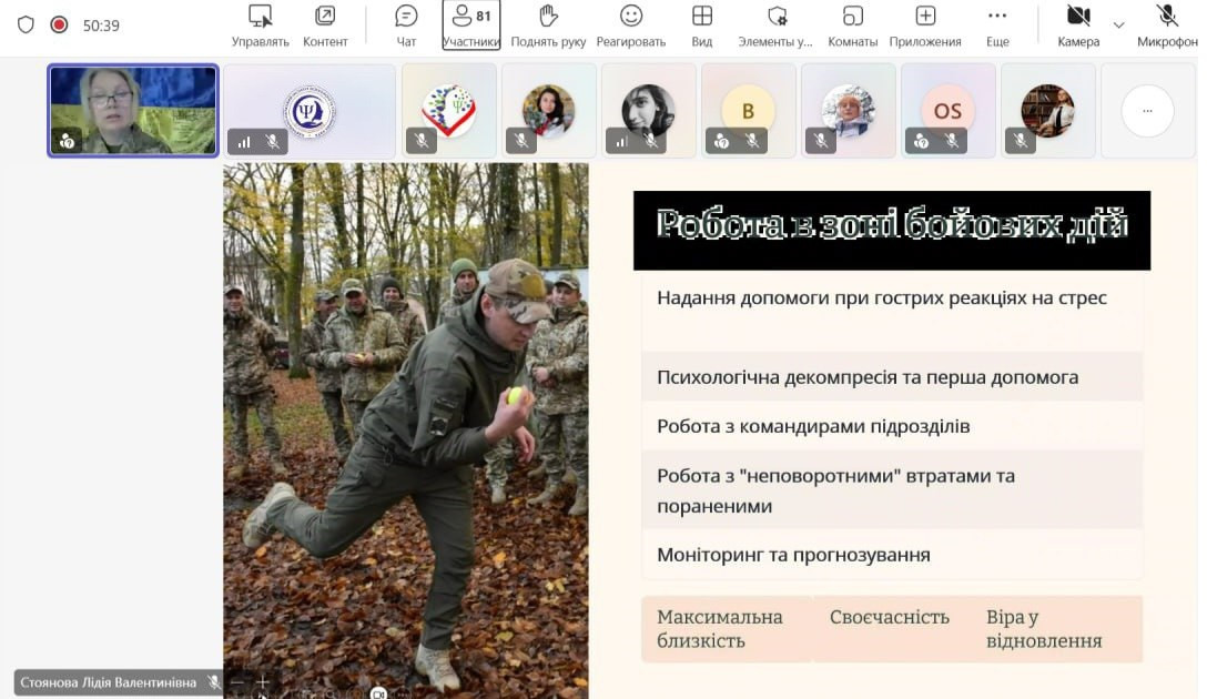 8 березня 2026 року відбулася зустріч на тему: «Військовий психолог у ЗСУ: задачі, функції та роль». Спікеркою заходу стала Оксана ЗЕЛЕНЕНЬКА — лейтенант, старший офіцер групи контролю бойового стресу 39 бригади морської піхоти, яка є випускниця освітньо-професійної програми другого (магістерського) рівня вищої освіти кафедри загальної та диференціальної психології.