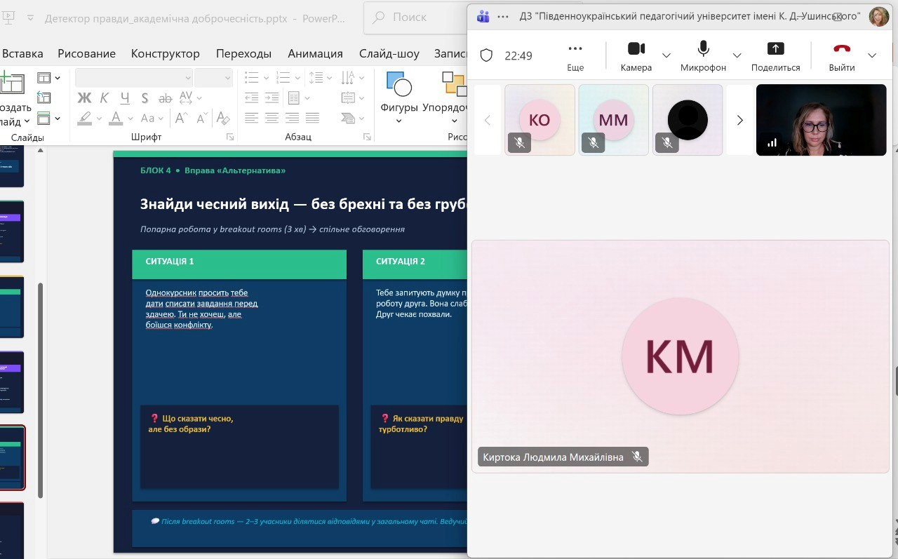 19 березня 2026 року в онлайн-форматі на платформі Microsoft Teams відбувся інтерактивний науково-просвітницький захід «ДЕТЕКТОР ПРАВДИ: Психологія чесності в сучасному світі» для здобувачів першого (бакалаврського) рівня вищої освіти. Захід провела кандидат психологічних наук, доцент кафедри теорії та методики практичної психології Державного закладу «Південноукраїнський національний педагогічний університет імені К. Д. Ушинського» Олена Юріївна Косьянова. Під час зустрічі було розглянуто психологічні механізми обману та самообману, основні мотиви брехні, а також поширені уявлення про детектор правди. Особливу увагу було приділено типології обманної поведінки, зокрема таким її різновидам, як соціальний захисник, адаптивний конформіст і процесуальний маніпулятор. Окремо обговорювалися практичні альтернативи обману в студентському житті та значення чесності як важливої особистісної й академічної цінності. Учасники заходу активно долучалися до роботи в чаті, обговорювали реальні кейси, виконували вправи в breakout rooms та шукали чесні формулювання у типових навчальних ситуаціях. Наприкінці зустрічі було зосереджено увагу на наслідках порушення академічної доброчесності відповідно до чинного законодавства, а також проведено рефлексію «Особистий кодекс чесності».