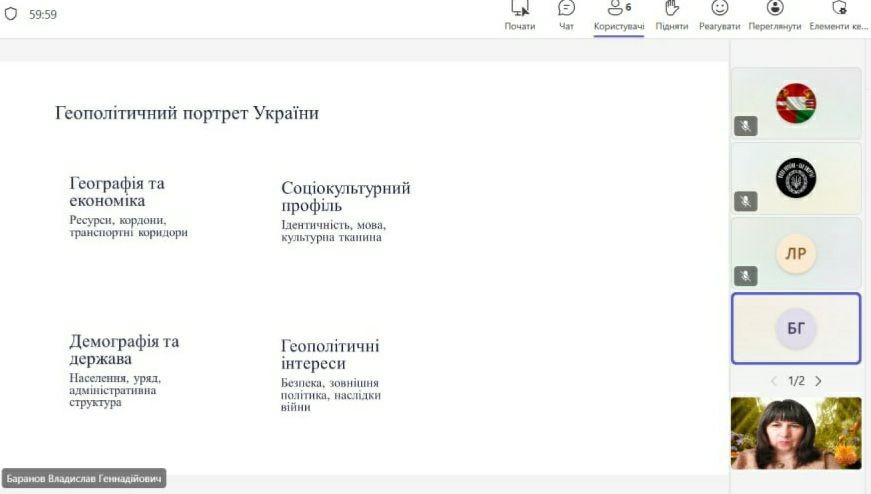 Сьогодні засідання студентського наукового гуртка «Міжнародні відносини та дипломатія» присвячено актуальній науковій та безпековій проблемі – геополітичному становищу України. Студенти 4 курсу спеціальності «Політологія» представили власні наукові проєкти «Геополітичний портрет України». Аспірант 2 року навчання спеціальності «Політологія» Микита Лагутін виступив в ролі політичного аналітика та ведучого засідання гуртка.