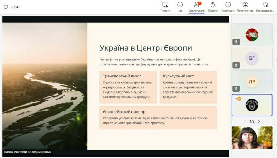 Студент Анатолій Казюк проаналізував геополітичне становище України, акцентувавши на економічному й ціннісному вимірі європейської інтеграції та збереженні унікальної культурної спадщині України.