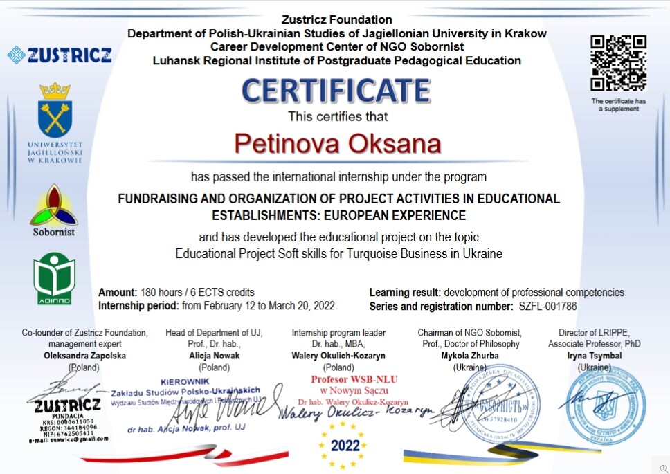 Міжнародне наукове стажування «Фандрейзинг та організація проєктної діяльності в закладах освіти: європейський досвід» (Польща – Україна), організаторами якого були: фундація «Зустріч» (Польща), кафедра Польсько-Українських Студій Ягеллонського університету (Польща), громадська організація «Соборність» (Україна), Луганський обласний інститут післядипломної педагогічної освіти (Україна) успішно завершилось. Дякуємо організаторам та лекторам за отриманий досвід та навички. Вітаємо науково-педагогічних працівників та аспірантів з отриманням сертифікатів!