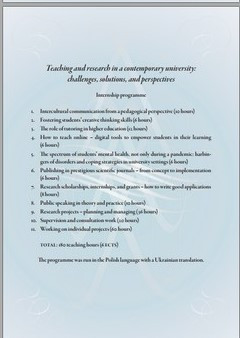 Під час стажування було опрацьовано наступні модулі: Модуль 1. Міжнародне співробітництво прикордонних університетів. Міжнародна співпраця між прикордонними університетами. Модуль 2. Вдосконалення процесу навчання студентів. Вебінари «Розвиток творчого мислення у студентів», «Онлайн-освіта – інструменти для активізації студентів», «Тьюторинг в роботі викладача». Модуль 3. Люди з обмеженими можливостями у ВНЗ. Модуль 4. Вдосконалення дослідницьких навиків. Вебінари: «Публікація праць в престижних наукових журналах – від ідеї до реалізації», «Методологія отримання грантів для наукових досліджень», «Теорія та практика публічних виступів». Під час стажування важлива увага була приділена формуванню навичок soft skills.