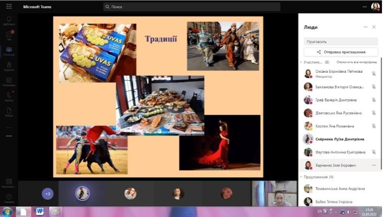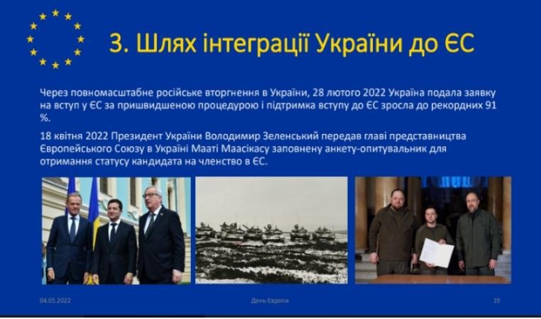 11 травня 2022 року зі студентами 4 курсу спеціальності 014 «Середня освіта (Мова і література (англійська))» (викладач – проф. Петінова О. Б.)було проведене відкрите інтегроване заняття з соціології, приурочене до Дня Європи. Обговорені питання права і гідності людини в Європі, європейська демократія та свобода; шлях інтеграції людини до Європейського Союзу. Студенти Дзиговська Яна та Смірнова Луїза підготували та виступили з презентацією «Особливості соціальної організації та соціального контролю Іспанії».