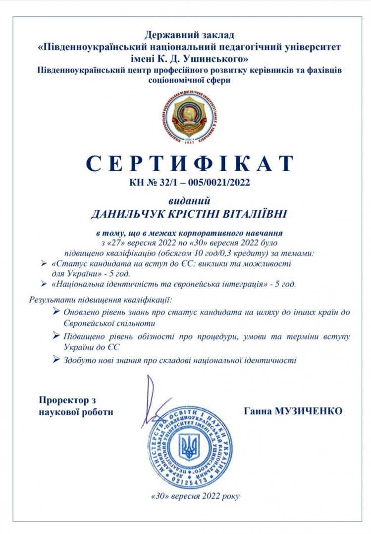 Науково-педагогічні працівники кафедри філософії, соціології та менеджменту соціокультурної діяльності, здобувачі третього (освітньо-наукового), ОНП «Філософія», та першого (бакалаврського) рівнів вищої освіти пройшли в межах корпоративного навчання підвищення кваліфікації за темами: «Статус кандидата на вступ до ЄС: виклики та можливості для України» (5 год.) та «Національна ідентичність та європейська інтеграція (5 год.)». Результати підвищення кваліфікації: оновлено рівень знань про статус кандидата на шляху до інших країн до Європейської спільноти; підвищено рівень обізнаності про процедури, умови та терміни вступу України до ЄС, здобуто нові знання про складові національної ідентичності. Вітаємо учасників з отриманням сертифікатів!