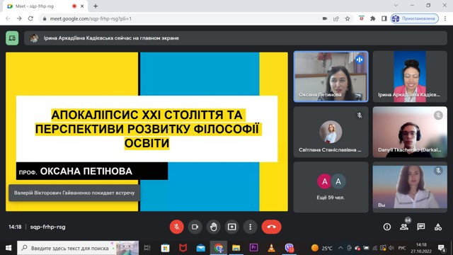 27 – 28 жовтня 2022 року науково-педагогічні працівники кафедри філософії, соціології та менеджменту соціокультурної діяльності (проф. Євген Борінштейн, доц. Зоя Атаманюк, доц. Галина Врайт, викл. Лариса Самчук) взяли участь у Всеукраїнській науково-практичній конференції «Інновації в освіті: сутність, проблеми, перспективи», що була організована кафедрою філософії, політології, психології та права Одеської державної академії будівництва та архітектури. На пленарному засіданні виступила проф. Оксана Петінова з темою «Апокаліпсис ХХІ століття та перспективи розвитку філософії освіти».