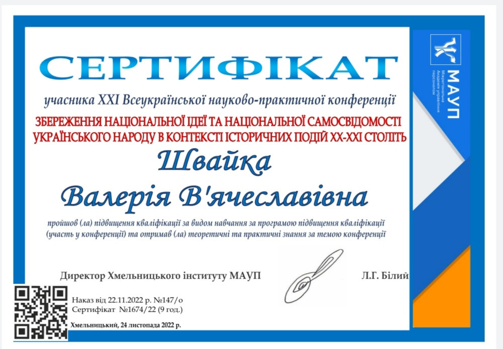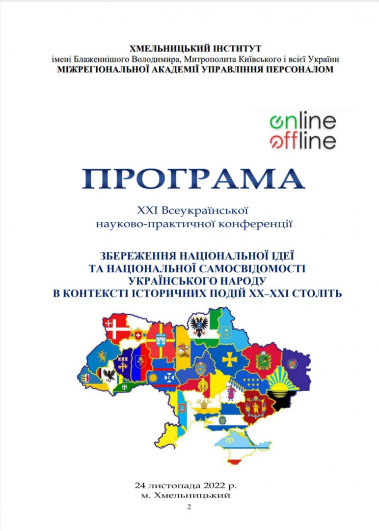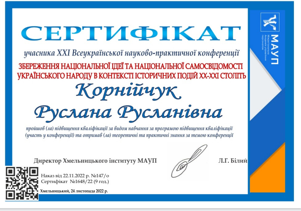Здобувачі першого (бакалаврського) рівня вищої освіти, ОПП Середня освіта (Українська мова і література) 2-го року навчання Олеся Аліханіді, Валерія Швайка, Лариса Шелест та ОПП Середня освіта (Історія) 1-го року навчання Руслана Корнійчук, – члени наукового гуртка «Південноукраїнські наукові студії» (керівник – проф. Оксана Петінова) взяли участь у ХХІ Всеукраїнській науково-практичній конференції «Збереження національної ідеї та національної самосвідомості українського народу в контексті історичних подій ХХ – ХХІ століть», що була проведена на базі Хмельницького інституту МАУП 24 листопада 2022 року. Студенти висвітлили такі теми як «Україна у другій світовій війні 1939 – 1945 рр.», «Соціальна проблема операції «ВІСЛА»», «Висвітлення голодомору 1932 – 1933 років у літературі».
