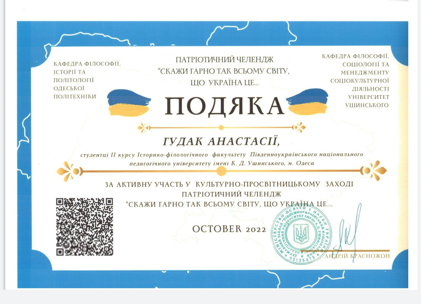 20221214_212812Відбулося підведення підсумків культурно-просвітницького заходу, організованого та проведеного кафедрою філософії, соціології та менеджменту соціокультурної діяльності (організатор – д. філос. н., проф. Оксана Петінова) та кафедрою філософії, історії та політології НУ «Одеська політехніка» (ЗВО-партнер) (організатор – к. філос. н., доц. Наталія Рибка) Патріотичного челенджу «Скажи гарно так всьому світу, що Україна – це…..».