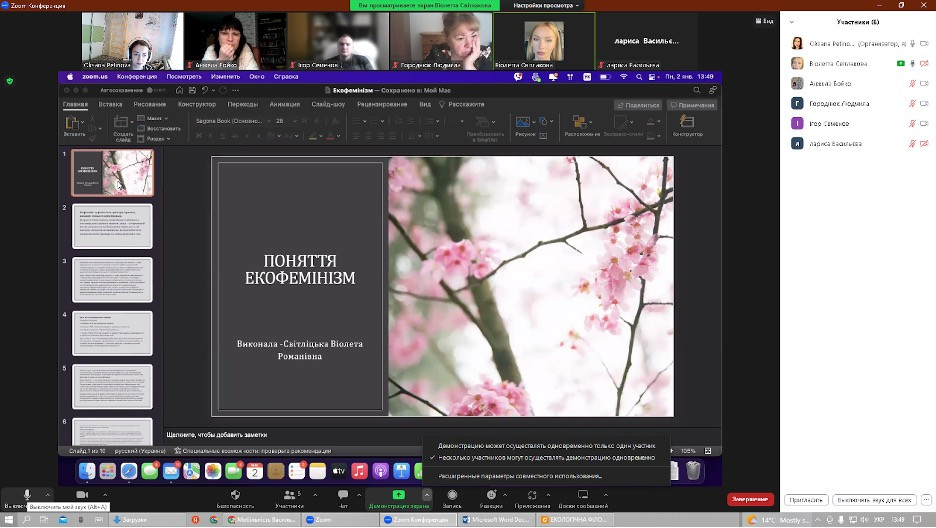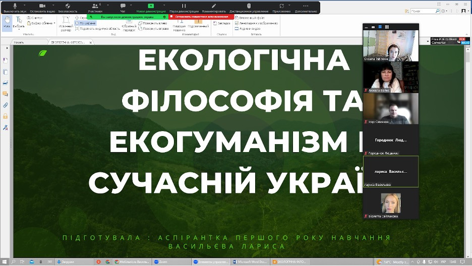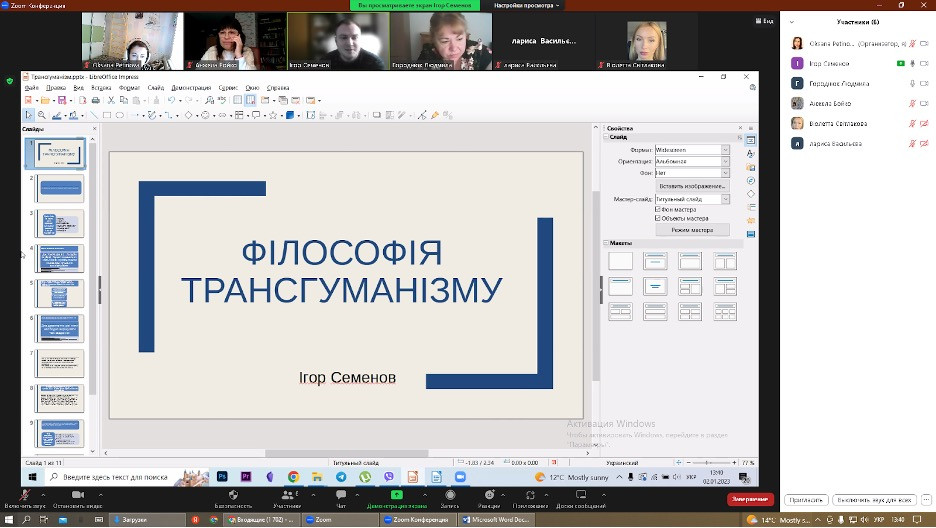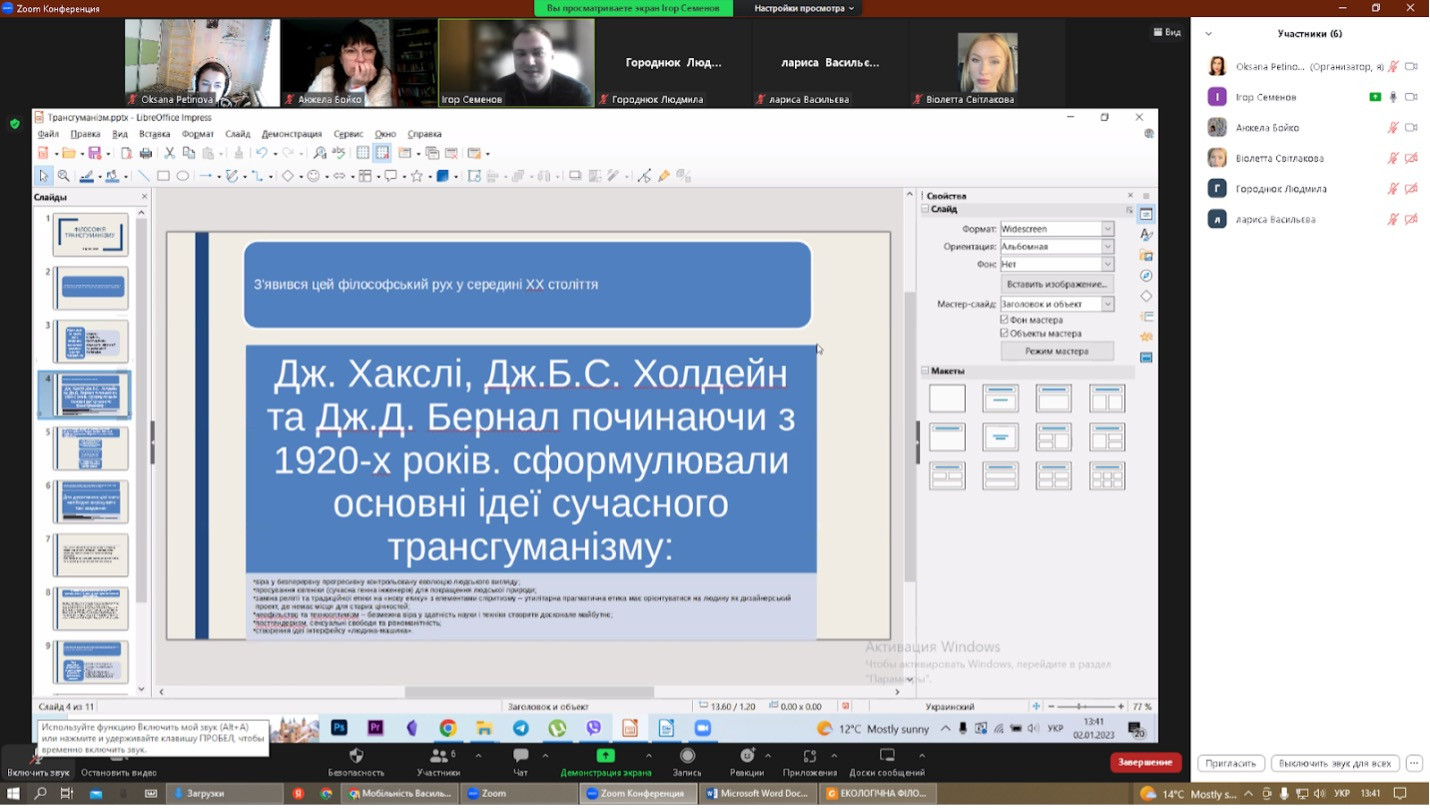12 січня 2023 року здобувачі третього (освітньо-наукового) рівня вищої освіти спеціальності 033 Філософія галузі знань 03 Гуманітарні науки успішно захисили підсумкові роботи (ІНДЗ), виконані в межах проходження програми кредитної академічної мобільності в Черкаському державному технологічному університеті, навчальна дисципліна – Філософський дискурс сучасної України.На захисті були присутні викладач дисципліни Анжела Бойко, докторка філос. н., професорка, завідувачка кафедри філософських і політичних наук ЧДТУ та гарант ОНП Філософія проф. Оксана Петінова. Виступили здобувачі з темами: «Філософія трансгуманізму» (Ігор Семенов), «Екологічна філософія та екогуманізм в  сучасній Україні» (Лариса Васильєва), «Технологічні революції та  майбутнє» (Людмила Городнюк), «Екофеміністична проблематика в українському науковому дискурсі» (Віолета Світлицька).