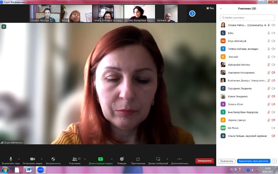 28 лютого 2023 року на запрошення гаранта ОПН Філософія проф. Оксани Петінової в межах реалізації україно-китайського освітньо-наукового проєкту «Освіта в глобалізованому суспільстві: філософія, менеджмент, культура (сучасні тенденції, економічні опції та міжнародні практики)» відбулася зустріч на тему «Бренд науковця в науковому середовищі Сходу».Спікер – Лідія Пироженко, доктор педагогічних наук, професор, експерт Міжнародного міжкультурного центру Університету Хучжоу. У заході взяли участь гаранти, наукові керівники ОНП Університету Ушинського, в тому числі науково-педагогічні працівники кафедри філософії, соціології та менеджменту соціокультурної діяльності (завідувач кафедри проф. Євген Борінштейн, проф. Олена Лісеєнко, доц. Зоя Атаманюк, викл. Лариса Самчук та інші), здобувачі третього (освітньо-наукового) рівня вищої освіти всіх форм навчання та спеціальностей, в тому числі, спеціальності 033 Філософія. На основі договору пор співпрацю долучились представники дружньої кафедри філософії та педагогіки ЗВО-партнера НТУ «Дніпровська політехніка», зокрема, гарант ОНП Філософія проф. Юлія Шабанова.