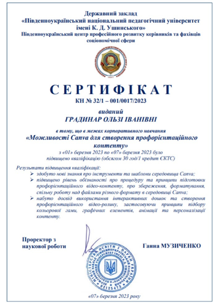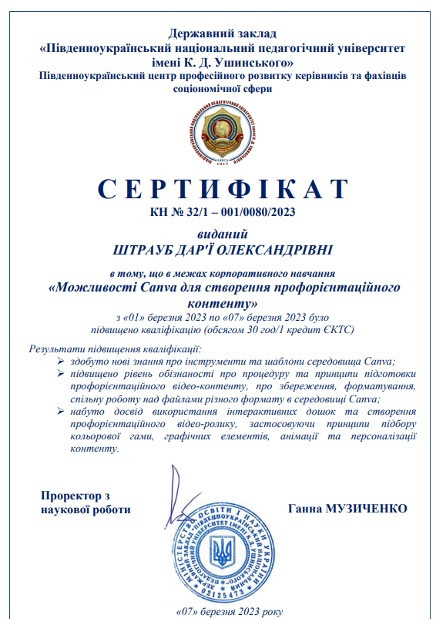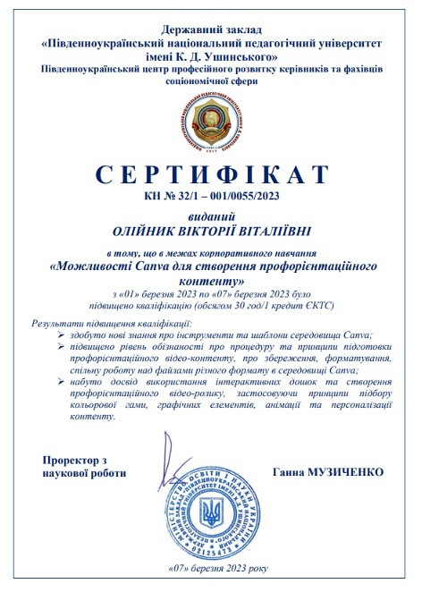 07 березня 2023 року на базі Південноукраїнського центру професійного розвитку керівників та фахівців соціономічної сфери Університету Ушинського (керівник – професор Наталія Черненко) завершилося корпоративне навчання «Можливості Canva для створення профорієнтаційного контенту» для студентів, аспірантів, співробітників та науково-педагогічних працівників Університету Ушинського, що розраховано на 1 кредит (30 годин) із відповідним сертифікатом.