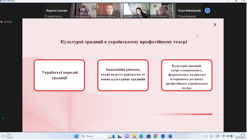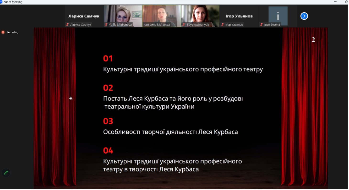 В рамках реалізації договору про співпрацю між ЗВО-партнерами НПП кафедри філософії, соціології та менеджменту соціокультурної діяльності, зокрема, гарант (проф. Євген Борінштейн) та здобувачі ОПП «Культурологія», гарант (проф. Олена Лісеєнко) та здобувачі ОПП «Менеджмент соціокультурної діяльності», гарант (проф. Оксана Петінова) та здобувачі ОНП «Філософія», а також доц. Зоя Атаманюк, викл. Лариса Самчук, доц. Галина Врайт, доц. Тетяна Поплавська долучилися до відкритої онлайн-лекції «Культурні традиції українського театру в творчості Леся Курбаса», яку провела Катерина Матвєєва (Інститут світової культури кафедри філософії і педагогіки Дніпровської політехніки).