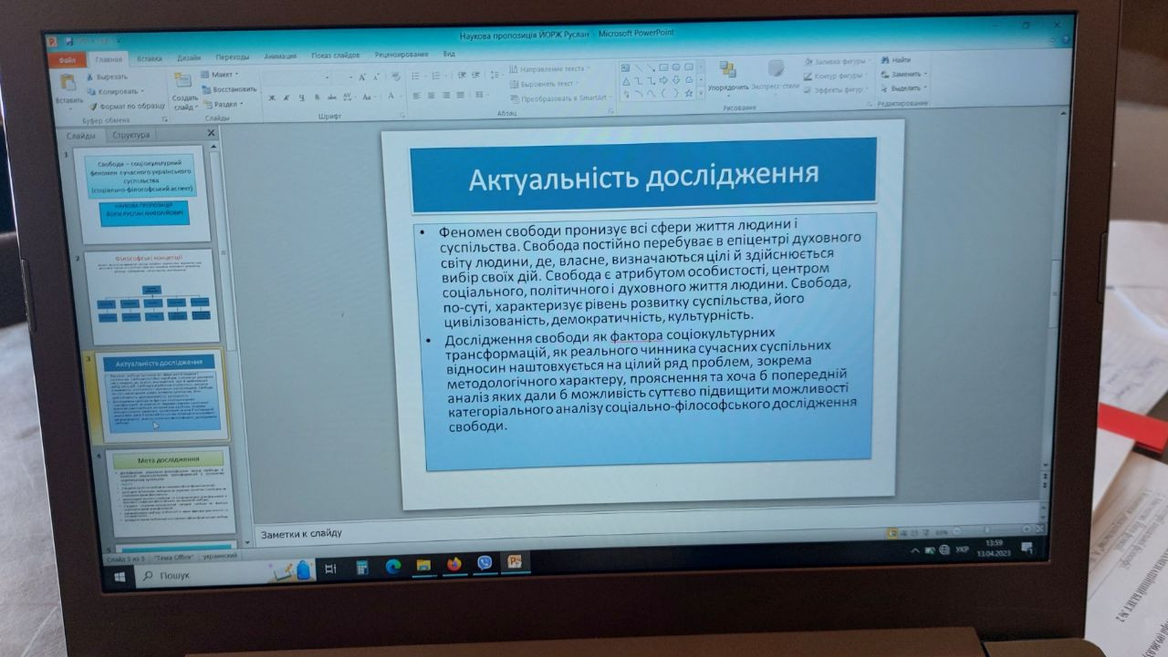 13 квітня 2023 року під час складання екзамену зі спеціальності майбутні аспіранти презентували свої дослідницькі пропозиції, в рамках яких обґрунтували актуальність обраної проблеми, зв'язок з трансформаційними процесами сьогодення, окреслили орієнтовні завдання майбутньої наукової розвідки.До презентацій долучилися потенційні наукові керівники здобувачів, які висловили власне бачення щодо запропонованої проблеми та перспектив отримання наукової новизни. До складу екзаменаційної комісії входили гарант ОНП «Філософія» проф. Оксана Петінова, та 2 члени групи забезпечення ОНП: завідувач кафедри філософії, соціології та менеджменту соціокультурної діяльності проф. Євген Борінштейн та доц. Зоя Атаманюк.
