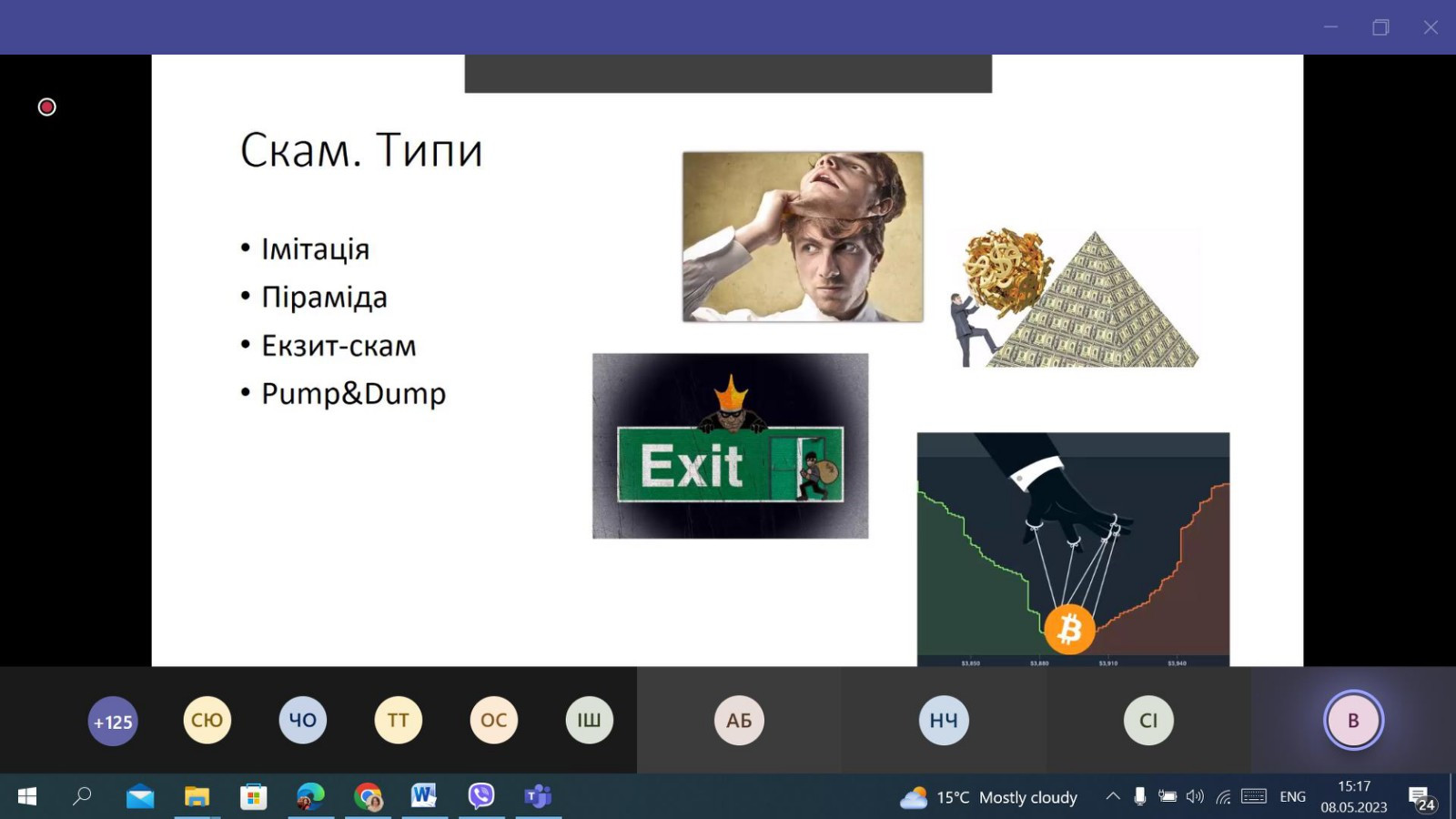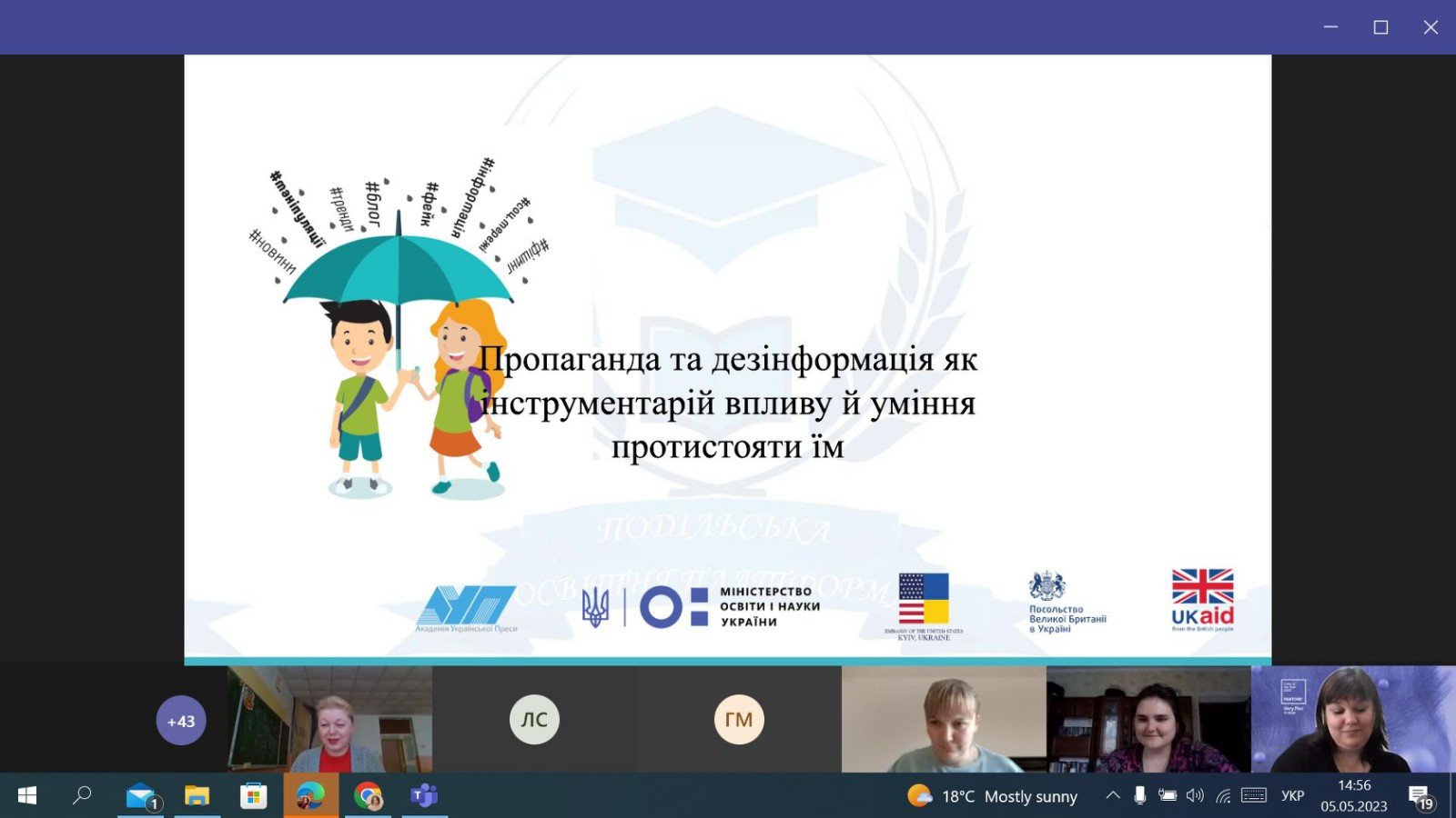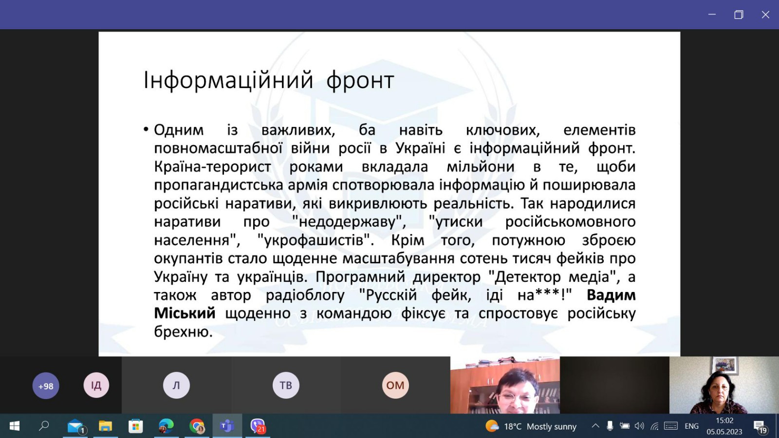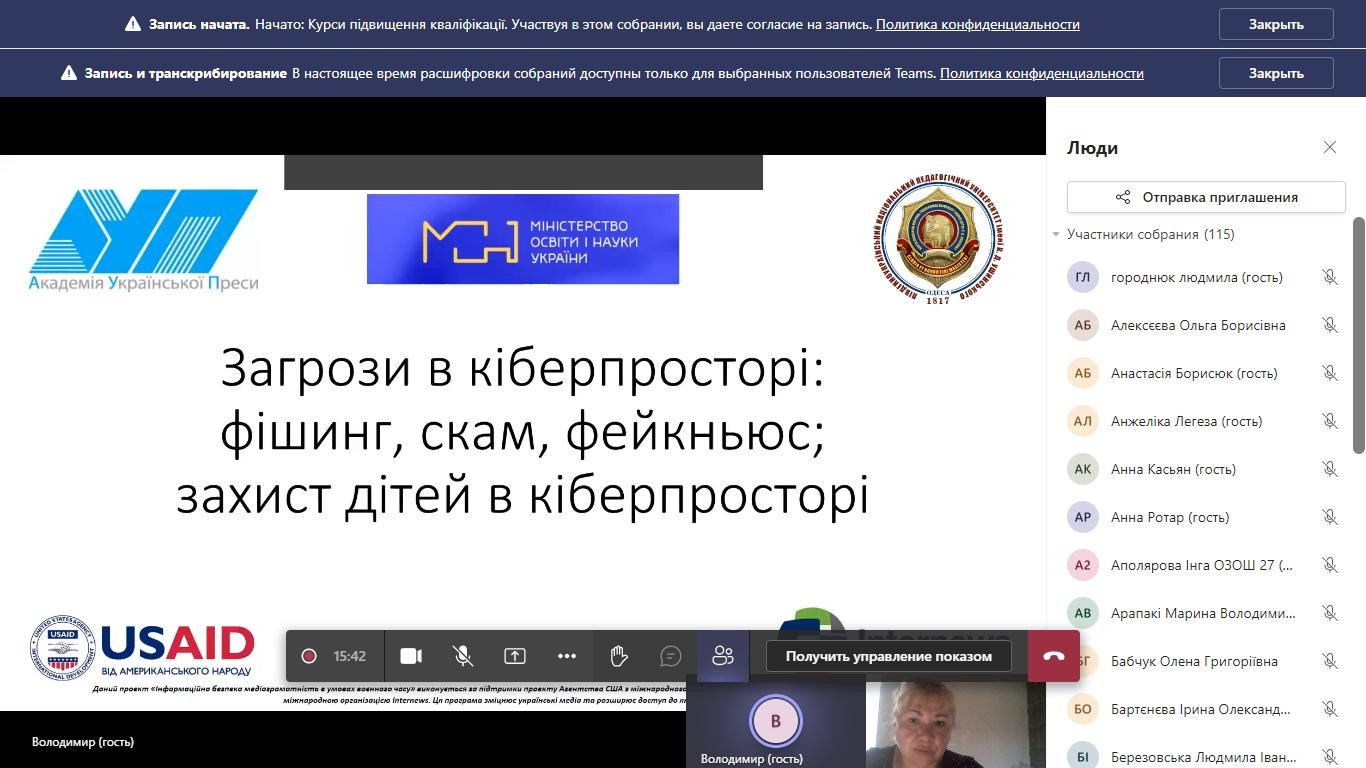 НПП кафедри філософії, соціології та менеджменту соціокультурної діяльності (проф. Петінова О. Б., доц. Начев А. П., доц. Врайт Г. Я., викл. Самчук Л. С.), здобувачі третього (освітньо-наукового рівня) вищої освіти ОНП «Філософія» (Інна Федорова, Віолета Світлицька, Марина Арапакі, Людмила Городнюк, Елеонора Бутенко, Ігор Семенов та інші), а також здобувачі першого (бакалаврського) рівня вищої освіти ОПП «Менеджмент соціокультурної діяльності» взяли участь у програмі підвищення кваліфікації за темою «Інфомедійна грамотність в умовах воєнного часу: виклики та протистояння».Пройшли такі заходи: вебінар «Мова толерантності та ворожості: виклики під час війни» (02.05.2023 р.); воркшоп «Поняття інформаційної війни. Упередження /стереотипи/ дискримінація. Глосарій термінів» (04.05.2023 р.); тренінг «Пропаганда та дезінформація як інструментарій впливу й уміння протистояти їм» (05.05.2023 р.); тренінг «Загрози в кіберпросторі: фішинг, скам, фейкньюс; захист дітей в кіберпросторі» (08.05.2023 р.). Програма підвищення кваліфікації організована на базі Південноукраїнського центру професійного розвитку керівників та фахівців соціономічної сфери у межах проєкту «Інформаційна безпека: медіаграмотність в умовах воєнного часу» за підтримки благодійного фонду «Академія української преси».