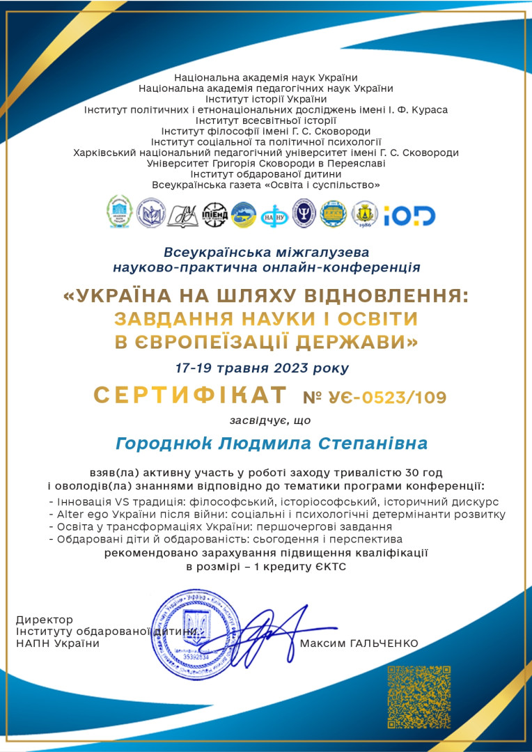 В межах реалізації договору про співпрацю здобувачка третього (освітньо-наукового) рівня вищої освіти ОНП «Філософія» Людмила Городнюк взяла участь у Всеукраїнській міжгалузевій науково-практичній конференції «Україна на шляху відновлення: завдання науки і освіти в європеїзації держави», що проходила в рамках Міжнародної виставки «Сучасні заклади освіти» на базі наукової установи-партнера «Інститут розвитку дитини НАПНУ України». На засіданні секції «Інновація VS традиція: філософський, історіософський, історичний дискурс» Людмила Городнюк представила доповідь на тему «Людинознавство і метапізнання як надважливі освітні категорії сьогодення» та апробувала проміжні результати свого дисертаційного дослідження. Чи отримує сучасний школяр певні знання, щоб мати уяву і міркувати про свою власну природу – знання об'єктивне і зрозуміле, про людину і світ, таке, що здатне стати джерелом пізнання, аналізу, порівняння, досвіду? Чи усвідомлюють наші діти, що людська природа – це надважливий предмет і об'єкт нашого осягання, бо прожити вік серед людей – це і головне призначення всіх і кожного? Людмила виступила із пропозицією впровадження в школі «Людинознавства» – комплексного знання, яке б інтегрувало ресурс з філософії, психології, психофізіології, антропології, соціології, біології, де центральними опціями стали б важливі і реальні життєві категорії: сенс життя, образ майбутнього, здоров'я і нервова система, соціальні ролі і зв'язки, мислення, призначення і світогляд, відносини і стосунки, втрати і розлучення, життєві виклики та стратегії подолання. Така навчальна дисципліна, могла б стати полем для пізнання і обговорення життя, можливих сценаріїв, хабом для прийняття рішень. Тема викликала значний інтерес, а Людмила отримала подяку за неочікувану і цікаву пропозицію. Вітаємо з результативним виступом та з нагородою!
